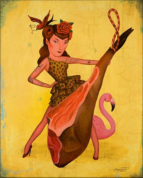 La Obra La trayectoria artística del pintor, dibujante e ilustrador Sergio Mora (Barcelona, 1975) es como un caleidoscopio audaz e incisivo, que remueve la conciencia del público y apuesta decididamente por el colorido. Formado en La Llotja, a través de sus creaciones descubrimos una brillante mitología que mezcla iconos populares con los que todos nos sentimos identificados con lo fantástico y lo sobrenatural, lo sorprendente y lo ilusorio. En realidad Magicomora, como a veces firma sus creaciones, es un artista multidisciplinar, con una prolífica obra que nos lleva a lo subversivo y lo circense, con hermosos monstruos y grotescas fantasías, en todos sus aspectos: pintura, ilustración, vídeo, cómic y performance. Su personal decálogo artístico y su idiosincrasia pictórica le han convertido en uno de los mayores exponentes del Surrealismo Pop de la Península. La pintura que nos ocupa (2010) es un imaginario del entorno andaluz donde se produce el mejor jamón del mundo. Las rosas y el flamenco, retratado con doble sentido, rodean a la carnal andaluza, siempre apurando cada momento como reza uno de sus tatuajes. Los atigrados volantes y las puntiagudas orejas confirman su carácter salvaje y pasional. El otro gran protagonista, el jamón, se asocia siempre a su fiesta preferida.