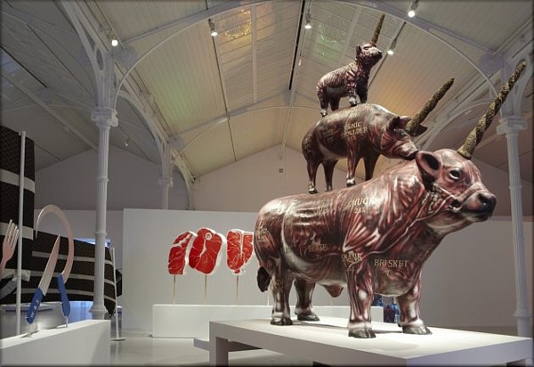 La Obra Wheat & Steak (Trigo y Bistec, 1981) es una escultura ilustrativa de las estrategias relacionadas con lo kitsch y la tendencia monumentalizante de la obra de Antoni Miralda (Tarrasa, Barcelona, 1942) dentro de la recurrente temática de la comida como construcción cultural que marca gran parte de su producción. Compuesta por animales y chuletones realizados con fibra de vidrio, madera, maíz y pintura, mediante la técnica del ensamblaje y el vaciado, en el origen de Wheat & Steak (518, 418 x 213 cm) se sitúan una serie de acciones realizadas por el autor en Kansas City, en el mismo año de su ejecución, con motivo de la feria anual de granjeros americanos. Miralda organizó un desfile a través del centro de la ciudad, una exposición en The Nelson-Atkins Museum, y la ceremonia Gold Taste, que tuvo lugar en la sede de la Bolsa de Cereales. De este modo, Miralda convirtió los festivales locales de Kansas City en marco para la elaboración de una obra que requirió una planificación de varios años y que se centró en aspectos como el intercambio de productos, la cultura gastronómica y el aspecto ritual y monumental del comportamiento social humano. La pieza fundamental de dicho desfile fue la escultura Tri-Uni-Corn (Tri-Cornio), formada por tres figuras de animales aptos para el consumo humano, superpuestas en estructura piramidal. El buey, el cerdo y la oveja, construidos en fibra de vidrio, con cuernos con granos de maíz encastrados, aparecen así como figuras a medio camino entre el unicornio mitológico y el tótem sacrificial dispuesto para una ceremonia ritual colectiva; apuntados ya sobre sus músculos, despojados de piel, los nombres de las diversas partes comestibles. En el año 2010 la obra estuvo presente en Miralda. De Gustibus non Disputandum, la primera gran retrospectiva del autor celebrada en el madrileño Palacio de Velázquez. Y es que la comida es un sistema semiótico para Miralda, como cuando realiza las banderas de las principales potencias con arroz de colores, que se pudre y se transforma, de modo que las banderas adquieren colores y significados nuevos. Desde 1996, con su FoodCulturaMuseum (Museo de Cultura de la Comida), Miralda crea una obra abierta a escala mundial con múltiples iniciativas, -como el gran pabellón para la Exposición Universal de Hannover del año 2000-, mediante infinidad de dispositivos con los que violentar los arquetipos museográficos. Su objetivo radica en la participación y examen de las culturas culinarias de todo el mundo, así como en la exploración de aspectos sobre la identidad social, sus rituales y las formas de preservación y de memoria.