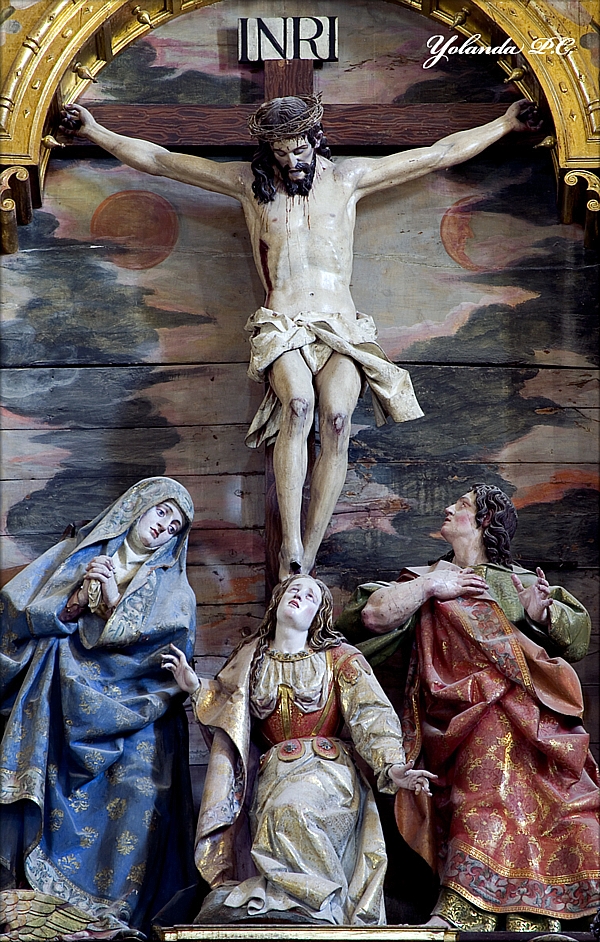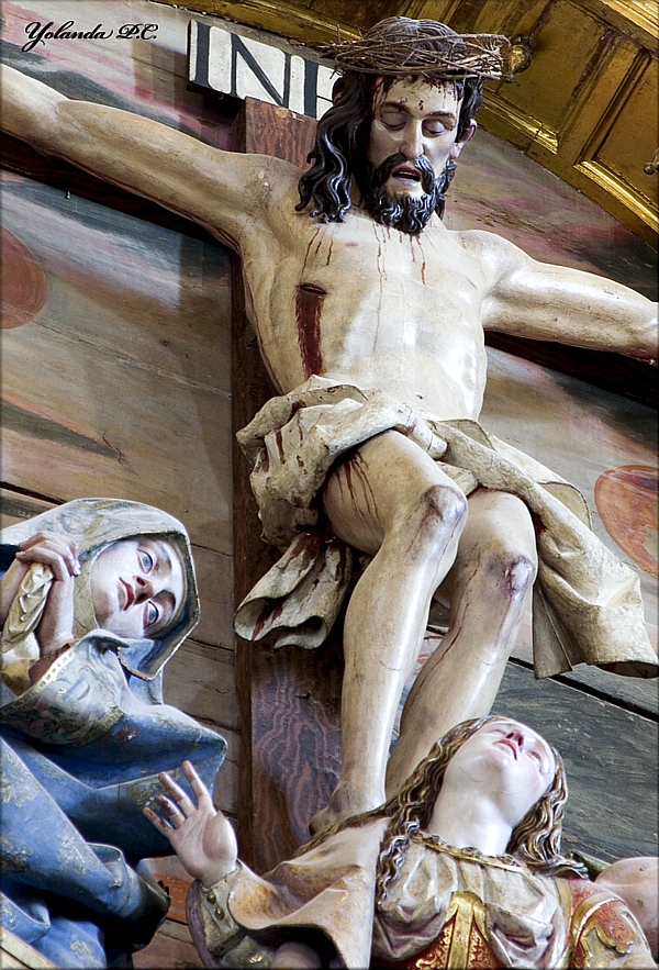 La Catedral de Plasencia acoge en su cabecera un monumental retablo del primer tercio del siglo XVII, que es una de las mejores obras del arte español y, sin duda, la mejor pieza salida de los talleres vallisoletanos del momento. El conjunto se estructura en banco, dos cuerpos y ático, con tres calles y sus correspondientes entrecalles. En la calle central se superponen el tabernáculo, el grupo de la Asunción y el Calvario. En las calles que la flanquean tenemos los cuadros de la Adoración de los pastores y la Anunciación, en el primer cuerpo, y la Circuncisión y la Epifanía, en el segundo. En el cuerpo bajo se sitúan las imágenes de San Pedro, San Pablo, San Juan Bautista y Santiago; mientras que en el superior están las de San Joaquín, Santa Ana, San Fulgencio y Santa Florentina. En el ático, acompañan al Calvario las tallas de San José, Santa Teresa y seis grandes ángeles. Los dos bancos acogen relieves de los evangelistas, los doctores y escenas de la Pasión, la Virgen y otros santos. Fernández introdujo una serie de modificaciones que ampliaron y mejoraron la traza de Alonso de Balbás, caso de la escena del Gólgota, al disponer que en ella, junto con las previstas de Cristo crucificado, la Virgen dolorosa y San Juan Evangelista, se incluyera también la figura de Santa María Magdalena, una innovación iconográfica que el artista ya había hecho, como elemento de compasión, en el retablo mayor de los Santos Juanes (Nava del Rey, Valladolid). El remate de este último cuerpo quizá fue precipitado y pudieron utilizarse piezas anteriores o del taller de Fernández porque, por ejemplo, San Juan fue serrado por la cintura: mientras el medio cuerpo superior míra de cara al crucificado, los talones de los pies evidencian que, de las caderas para abajo, está forzado en la dirección contraria. |