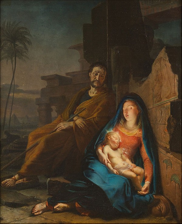 A José un ángel le advirtió en sueños que llevara a su familia a Egipto para escapar del rey Herodes, que tenía la intención de masacrar a todos los varones recién nacidos, en un intento de matar al llamado "rey de los judíos", del cual había oído hablar a los magos. En esta pintura, enmarcada en las ruinas de un templo del Antiguo Egipto, María y el pequeño Jesús toman ahora el papel de durmientes, agotados por el perentorio viaje. José, como padre y protector, permanece en vela, observándolos y guardando su sueño, mientras ambos yacen sobre uno de los muros del templo, ricamente decorado con relieves policromados y parcialmente destruido, lo que conecta la escena con la destrucción de los ídolos, que, según los apócrifos, tuvo también lugar durante el exilio a Egipto. Ya sabemos que estos pasajes, si bien no se encuentran en la Biblia, fueron aceptados por la Iglesia como parte de su programa de reforzamiento del carácter humano de la Sagrada Familia. Esta obra de la Burghley House (Stamford, UK) fue pintada mediante la técnica del óleo sobre lienzo (51 x 42 cm) por el francés Charles Fournier (1803-1854), artista poco conocido del que apenas se saben datos biográficos. Por sus trabajos se observa que su especialidad fue el retrato femenino, bien en solitario, bien acompañada la retratada de uno o varios niños, mostrando siempre un estilo académico propio de los pintores decimonónicos. Dicha especialidad la llevó al terreno del arte sacro, como podemos ver en la pieza que nos ocupa. |