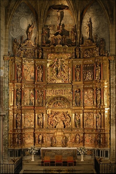 Se trata de un retablo de grandes dimensiones, de desarrollo vertical y adaptado a la cabecera de la Iglesia de San Esteban Protomártir del municipio riojano, por lo que sus calles laterales se doblan. Los elementos horizontales son un banco, tres cuerpos y los remates de cada calle, destacando el de la calle central que culmina con un templete rematado por un Calvario. Los componentes verticales son tres calles y cuatro entrecalles que se proyectan hacia el exterior. La calle central, como sucede en otros retablos documentados de Beaugrant, presenta un extraordinario desarrollo, tanto en anchura como en verticalidad. El origen de su probable autor, Guiot Beaugrant, se sitúa en los Países Bajos. Es vecino de Malinas y trabaja para Margarita de Austria. Se instaló en Bilbao entre los años 1531 y 1533. Paralelamente a la realización de su obra en Vizcaya, se traslada, acompañado de su taller, a la Rioja Alta, donde contrata el retablo de Elvillar (durante cuya realización fallece, al parecer en aquella villa, entre los años 1549 y 1550). Se le atribuye también el presente retablo y, cuando menos, colaboración en el de San Vicente de la Sonsierra. El renacimiento que trae este maestro a nuestro país está teñido de goticismo, esto de alguna manera lo hace más fácilmente asimilable a la tradición escultórica de una zona no demasiado al corriente de los últimos avances artísticos. Guiot Beaugrant adaptó su capacidad técnica a los gustos del mercado hispano, todavía más próximo a las obras tradicionales que al estilo manierista a la italiana. Este es uno de los puntos más importantes en la evolución del estilo de su taller, la progresiva adaptación de motivos castellanos (vallisoletanos principalmente), tomados de los principales talleres. En el retablo que nos ocupa pudo intervenir su hermano Juan, avecindado en Ábalos poco antes de su muerte en el año 1559. Otro hermano menor, Mateo, intervino en el de Elvillar hasta el año 1554. Apenas se conocen los nombres de otros miembros del taller de Guiot. Por otro lado, conocemos la participación en sus obras de autores ajenos al taller, como Juan de Ayala, Andrés de Araoz o Arnao de Bruselas. Esto nos plantea la incógnita de la existencia en Ábalos de colaboradores ajenos al taller. Es también muy arriesgado intentar diferenciar las distintas manos de un taller en el que no aparecen totalmente definidas las distintas personalidades y más cuando se tienen precedentes de colaboraciones. Como hemos apuntado llama la atención del retablo su calle central, que rompe la estructura tradicional del retablo casillero. Su desarrollo, próximo al retablo que años antes habían realizado Siloe y Bigarny para la Capilla del Condestable de Burgos, no se corresponde totalmente con la articulación en pisos del resto del retablo, destacando en ella el impulso vertical. Presenta dos registros principales: el primero rematado por un arco de medio punto que cobija y completa la escena principal; inmediatamente, sobre este arco, tres diminutas escenas rompen el sentido vertical de la calle y sirven de base al siguiente registro, éste, también más alto que las calles, se remata con un arco rebajado que sobresale junto a los remates de las calles laterales. Sobre este último registro se asienta un templete de cinco caras, tres de ellas al frente, articuladas por columnillas y encasamientos con figuras exentas. Sobre este templete se levanta el Calvario. La policromía es posterior, probablemente de inicios del XVII. Se adapta perfectamente a las esculturas y las revaloriza. En los relieves se consigue realzar el escaso trabajo de gubia gracias al empleo de trazos más oscuros en los pliegues. Cuida con especial atención y lujo las escenas del primer cuerpo, decorado con flamas rematadas por bustos, motivos vegetales y escenas en la dalmática de San Esteban alusivas a su historia. |