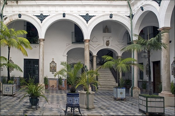 Delante del altar mayor y presbiterio se halla una lápida con el escudo de armas del marquesado y la siguiente inscripción: "ESTA CAPILLA ALTAR Y BÓBEDA ES DE D. BRUNO BERDUGO Y ARMENGUAL DE LA MOTA, MARQUES DE CAMPO ALEGRE; CAVALLERO, DEL ORDEN DE SANTIAGO, DEL CONSEJO DE S.M. EN EL R. DE HACIENDA; VEINTE Y CUATRO PERPETUO DE LA CIUDAD DE SEVILLA, Y SU LEXITIMA MUGER Dª ALFONSA OBRiEN Y OCCONOR Y FUE ACOMPAÑADO SU CADAVER POR EL MARQUES DE CAMPO ALEGRE, SU MARIDO, DESDE DICHA VILLA A ESTA CIUDAD Y SE COLOCO EN ESTE SITIO A 29 DE MAIO DE 1748". Una mesa de altar barroca, con decoración de rocalla y escudo del Carmen, sirve para la celebración de la misa cara al pueblo. El sagrario, de madera dorada, estilo barroco y orden toscano, tiene una puerta con un relieve policromado que representa la Oración del Huerto. El altar mayor es de estilo neoclásico del siglo XIX, de orden jónico con frontón curvo. Es de madera pintada, imitando mármoles jaspeados. El patio principal es una combinación de lo genovés, lo holandés y lo andaluz, lográndose un conjunto característico gaditano con el pavimento de losas blancas y grises de Génova, azulejos de Delf encintados entre ladrillos y tabicas de jaspe, y la mezcla de hierros forjados y enlucidos con cal. Tiene una crujía de tres arcos de medio punto por cada lado, apoyados sobre columnas de mármol de orden toscano sobre pedestal. Un Via Crucis, colocado en torno al patio principal, se ha conservado completo y en perfecto estado. Compuesto por piezas de 20 x 20 cm, cada escena tiene aproximadamente 100 x 60 cm, sin incluir el pequeño medallón inferior sostenido por angelitos que indica el número de la estación, ni la cruz que lo corona. Están hechos en terracota vidriada, técnica relativamente frecuente en los talleres sevillanos de mediados de la centuria. Estos marcos no están situados correlativamente, para que así cada estación guarde con la siguiente la misma distancia y medida que existe en Tierra Santa. Por último, la escalera, única en España, es todo un símbolo. Como núcleo del edificio, centro de reunión y repartidora de circulación hacia las diferentes plantas, está impregnada de ambiente religioso. Consta de seis tramos dobles con dos mesetas o rellanos centrales, y la superficie rectangular sobre la que se levanta tiene que dar acceso a un entresuelo y a la planta noble con dos puertas fronteras en el primero, y seis en el segundo. Posee las características barrocas de las escaleras andaluzas, su gran dinamismo y concepto espacial nos invita a subir por ella, y es tan ingeniosa la distribución de los tramos que el espectador, al querer descubrir la disposición y el desarrollo de la escalera, sube arriba sin darse cuenta ni sentir cansancio, asombrado y divertido al ver cómo ha sido resuelto el problema. |