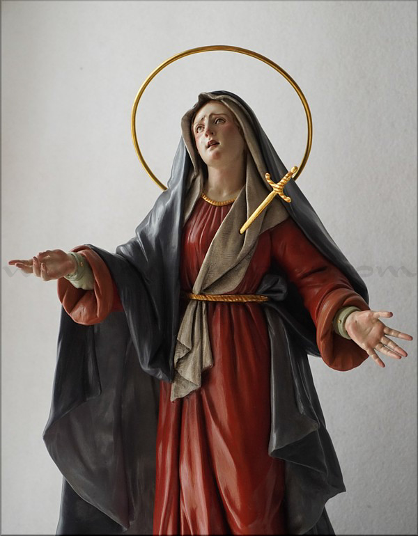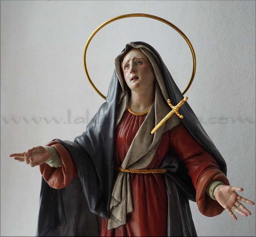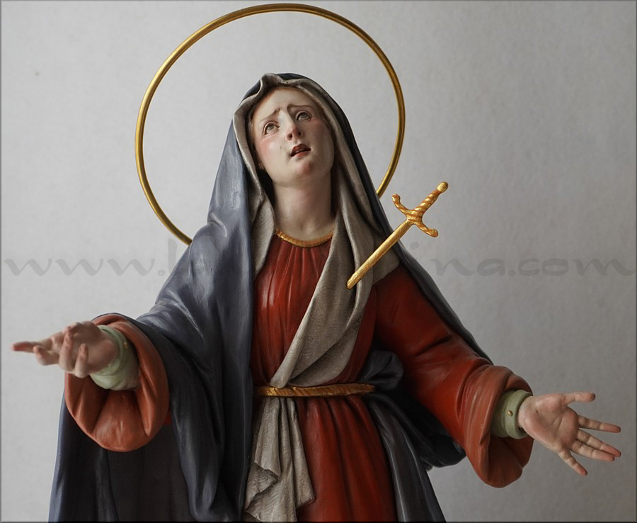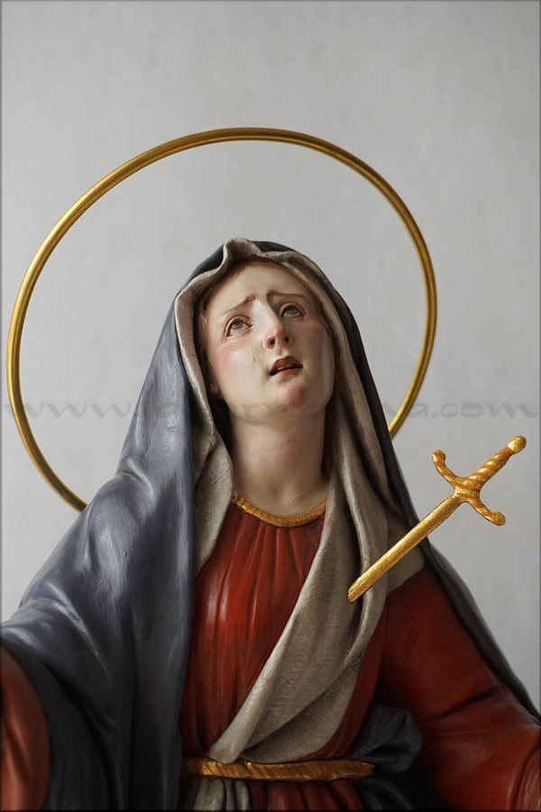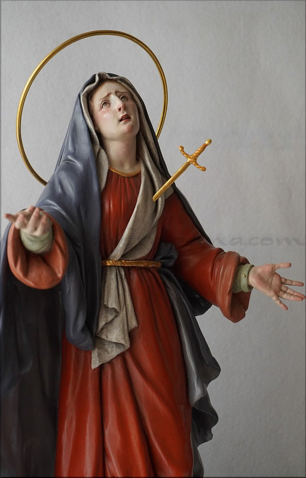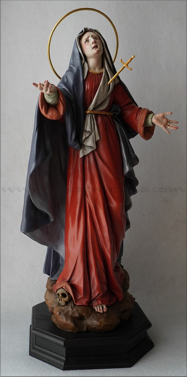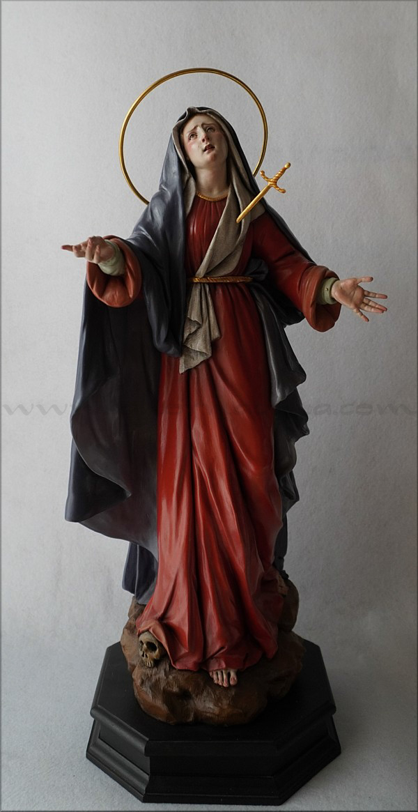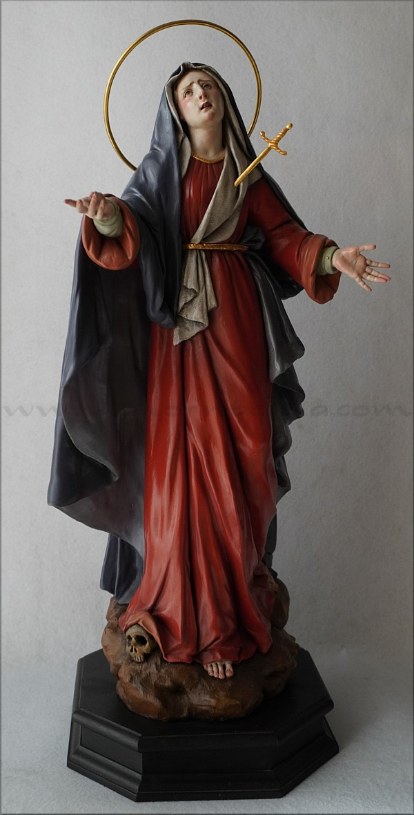 A pesar de sus reducidas dimensiones (50 cm) esta Dolorosa presenta un empaque monumental propio de las representaciones a gran escala de la escultura barroca italiana. De rostro hermoso y silueta estilizada, forma parte de la iconografía del Stabat Mater, con María al pie de la cruz, su dolorida mirada clavada en la de Jesús, y los brazos abiertos, deseando recibir el cuerpo del Hijo muerto en su regazo. Con esta pieza en terracota policromada al óleo, el joven artista colombiano, afincado en Córdoba, vuelve a ofrecernos una sensible interpretación de esta popular iconografía. Los colores del atuendo -blanco, azul y rojo- son intensos y se asocian a la simbología inmaculista, relativa a la pureza y al amor materno. Detalle singular es que la Virgen no pise la serpiente sino el cráneo de Adán, que según la tradición estaba enterrado en el mismo Gólgota, lo que simboliza igualmente la victoria de María como nueva Eva que derrota el mal y la muerte. |