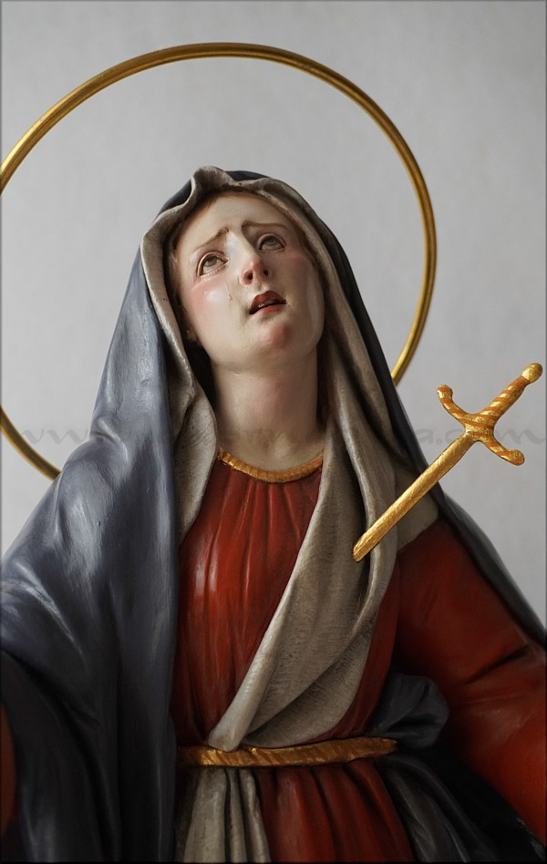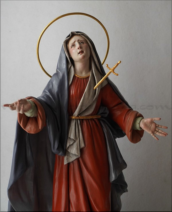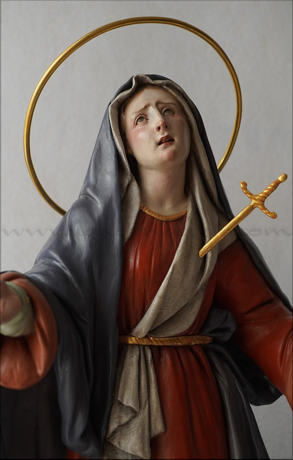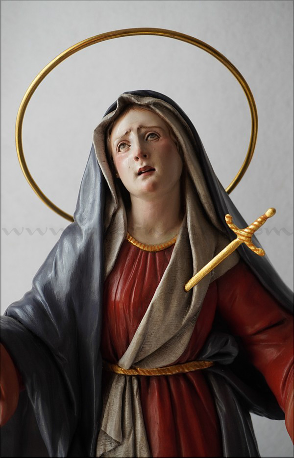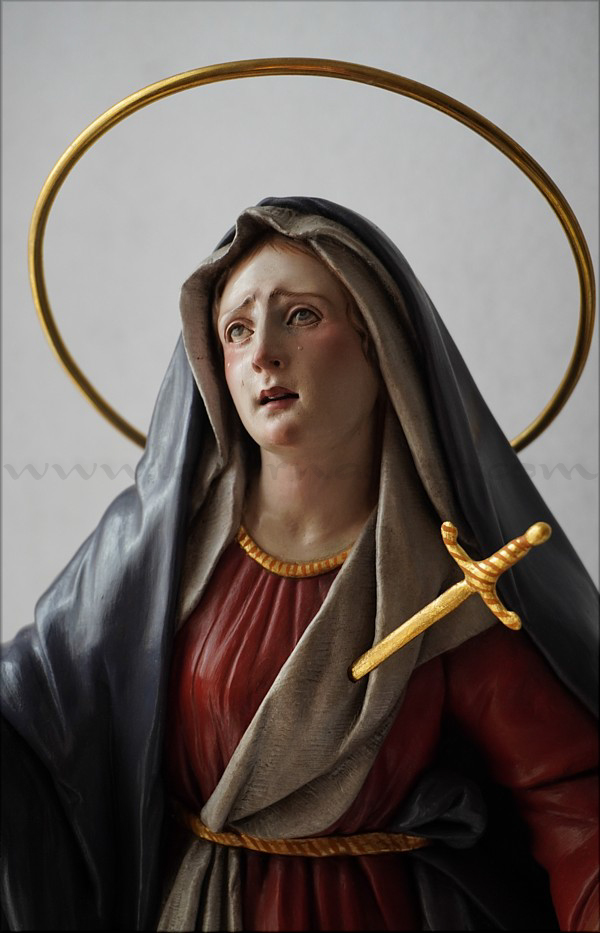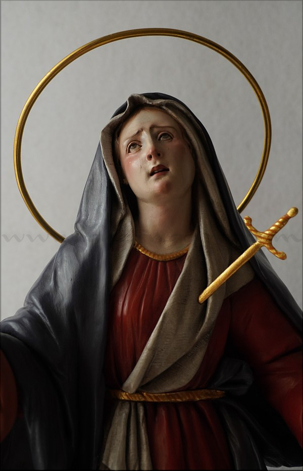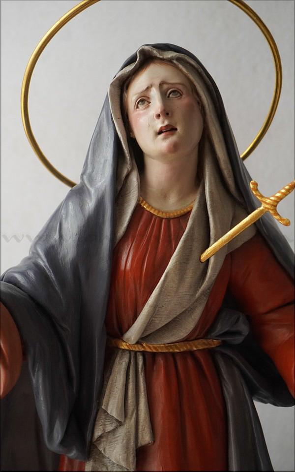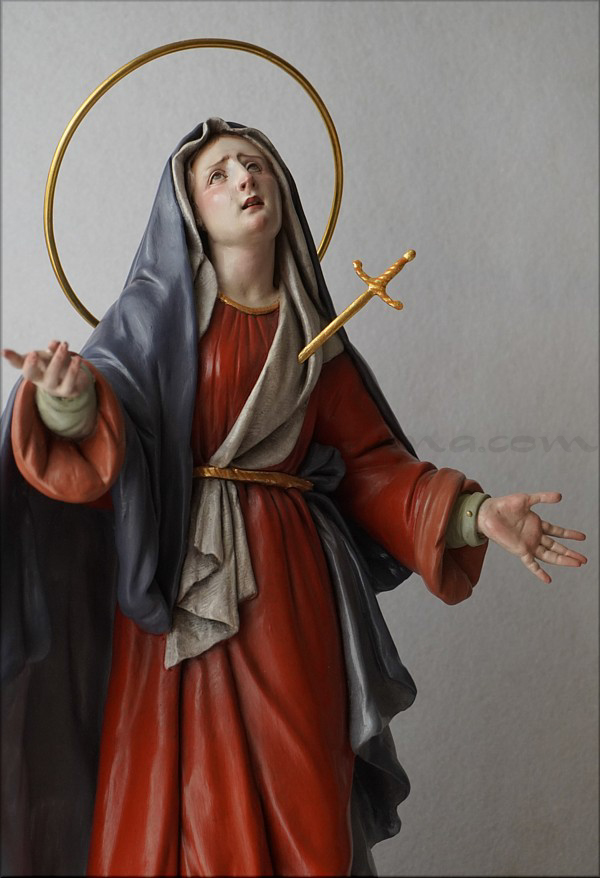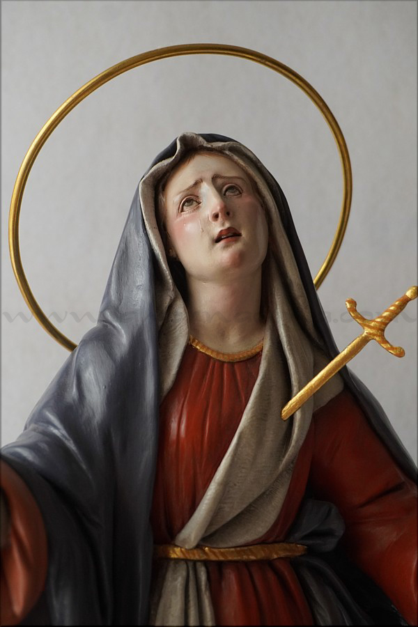 A pesar de sus reducidas dimensiones (50 cm) esta Dolorosa presenta un empaque monumental propio de las representaciones a gran escala de la escultura barroca italiana. De rostro hermoso y silueta estilizada, forma parte de la iconografía del Stabat Mater, con María al pie de la cruz, su dolorida mirada clavada en la de Jesús, y los brazos abiertos, deseando recibir el cuerpo del Hijo muerto en su regazo. Con esta pieza en terracota policromada al óleo, el joven artista colombiano, afincado en Córdoba, vuelve a ofrecernos una sensible interpretación de esta popular iconografía. Los colores del atuendo -blanco, azul y rojo- son intensos y se asocian a la simbología inmaculista, relativa a la pureza y al amor materno. Detalle singular es que la Virgen no pise la serpiente sino el cráneo de Adán, que según la tradición estaba enterrado en el mismo Gólgota, lo que simboliza igualmente la victoria de María como nueva Eva que derrota el mal y la muerte. |