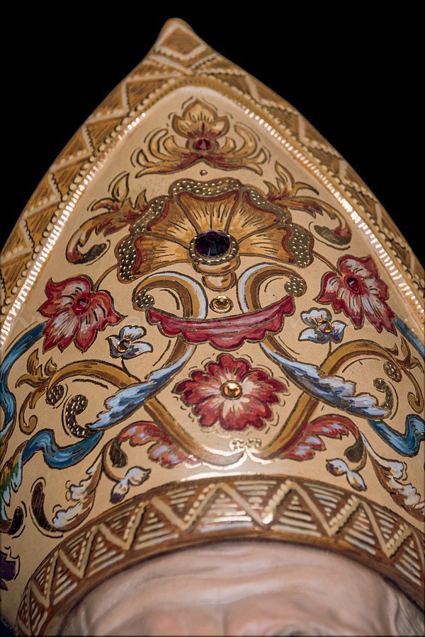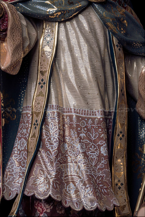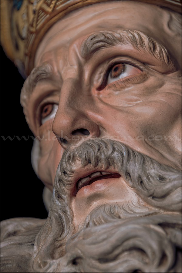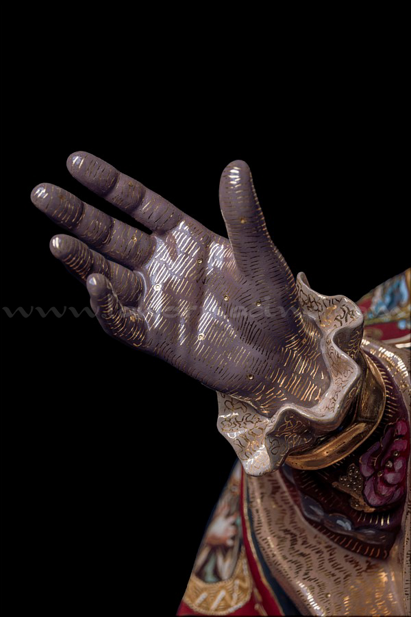 San Nicolás de Bari. Obra de talla completa para una colección particular andaluza que será presentada próximamente en Sevilla. Mide 1 metro de altura sin la peana y representa al santo obispo de Myra con la mitra, el báculo y tres niños en un barril, en alusión a los milagros que se le atribuyen, según los cuales resucitó una vez a tres niños que murieron al caer de un árbol y una segunda vez a otros tres que fueron sacrificados para ser servidos como comida. Fue enterrado en la ciudad de Bari (Italia), razón por la que se lo recuerda como san Nicolás de Bari. Su nombre dio origen a Santa Claus (contracción de Sanctus Nicolaus, en latín). La escultura ha sido tallada íntegramente en madera de cedro real, estucada, dorada al completo en oro fino por el dorador Pablo de Haro y estofada al temple por el pintor Manuel Peña Suárez, quien se luce en la decoración ornamental renacentista de los paños, especialmente en la capa pluvial compuesta por una cenefa de aves fénix y delfines marinos que se entrelazan para rodear seis óvalos que recogen bellas pinturas de los santos Miguel, José y Juan de Dios, la Inmaculada y los milagros en vida de San Nicolás. La expresión del obispo tiene una fuerte carga naturalista y, a la vez, espiritual. El autor da rienda suelta a los cabellos y las barbas canas. El báculo ha sido cincelado en metal dorado por el orfebre Miguel Ángel Cuadros Belizón. De cara a su trabajo, Martín Nieto ha contado con su equipo habitual, formado por Juan José Fernández Almagro y Antonio Jesús Ángel Verdugo. El escultor e imaginero de Morón de la Frontera (Sevilla) quiere agradecer al propietario de esta obra la confianza depositada en su trabajo y la máxima libertad creativa que le ha dejado a la hora de llevar a cabo esta escultura sacra que representa a San Nicolás de Bari. |