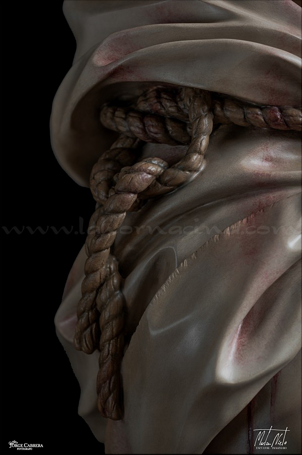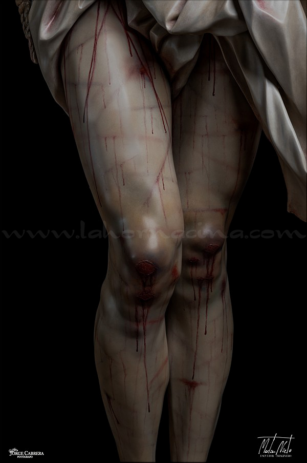 Esta escultura de Cristo crucificado (Cristo del Amor) tiene como destino la Basílica y Santuario Nacional de María Auxiliadora que se encuentra en la ciudad de Erin (Wisconsin), dentro de un paraje que los colonos irlandeses bautizaron en el siglo XIX como Holy Hill (Colina Sagrada). A mediados de septiembre quedará expuesta durante al menos quince días en el templo sevillano del Santo Ángel, y en octubre será entronizada en el referido lugar de culto estadounidense, que desde 1906 está regentado por la Orden de los Carmelitas Descalzos. La figura mide 185 cm de altura. Ha sido tallada íntegramente en madera de cedro real, lo que incluye también la cruz y el INRI. Representa a Jesús muerto en la cruz, a la que aparece fijado por cuatro clavos, con las muñecas perforadas y los pies reposando sobre un supedáneo. Muestra el costado abierto tras la lanzada, y en su rostro una expresión de dulzura y amor infinito por la humanidad, de ahí su título. Esta obra sigue un corte clásico y naturalista en su ejecución. El sudario presenta pliegues más amplios que en otras versiones sobre el tema de Martín Nieto, apreciándose su gusto por los pequeños detalles en los hilos sueltos del tejido. La corona de espinas también está tallada íntegramente en cedro, en un bloque de madera con espinas naturales. Por último, las policromías, ricas en matices, han sido aplicadas completamente al óleo, de forma minuciosa desde el propio estuco mediante veladuras y transparencias, y concluidas con una pátina muy suave. |