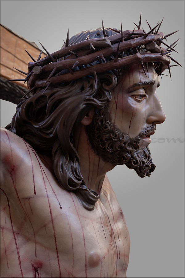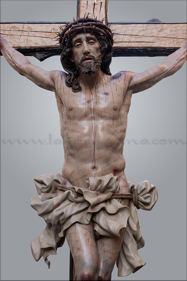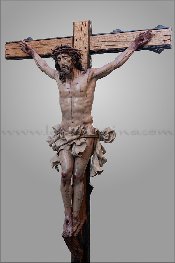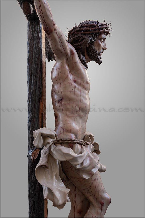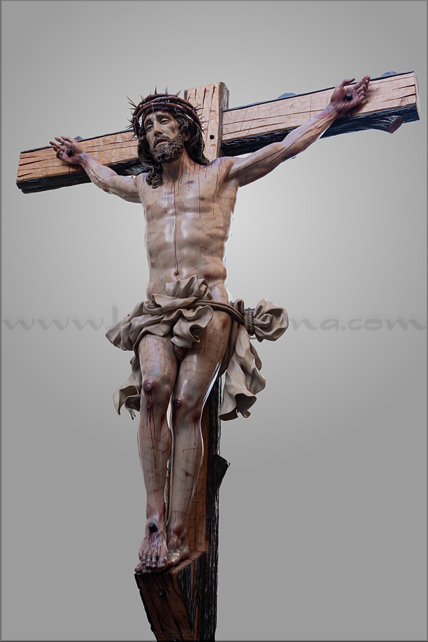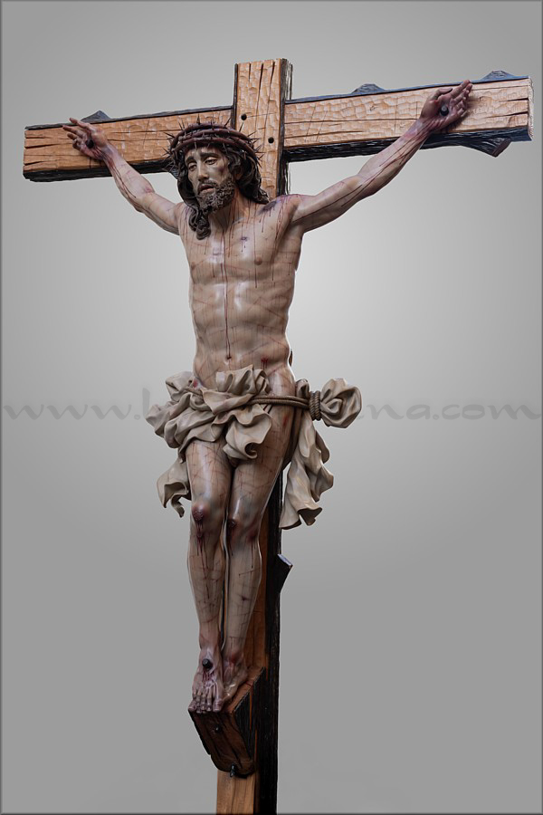Cristo crucificado Obra realizada para Mellau (Austria) por encargo del sacerdote Thomas Huber. Es de tamaño natural (170 cm), representado vivo por expreso deseo del cliente, con la mirada frontal buscando el encuentro con los fieles. Ha sido tallado íntegramente en madera de cedro real, incluida la cruz de sección plana y rectangular a la que está sujeto con tres clavos. Este detalle, junto al amplio movimiento del sudario, obedece también a un requerimiento de Huber. En el resto de la composición el escultor e imaginero moronense tuvo plena libertad de creación. El Crucificado apoya los pies y el peso del cuerpo sobre el supedáneo. La corona de espinas, también tallada en cedro, forma parte del mismo bloque craneal, como suele ser habitual en Martín Nieto. La expresión de Jesús está trabajada con especial cuidado para invitar al silencio contemplativo y la oración profunda. La policromía, realizada completamente al óleo, está ejecutada mediante veladuras suaves que realzan con delicadeza los signos de la Pasión. El autor quiere expresar su agradecimiento a su equipo de trabajo: Juan José Fernández Almagro, Antonio Jesús Ángel Verdugo y su discípulo Gonzalo Quesada, así como a Jorge Cabrera por el excelente reportaje gráfico. |