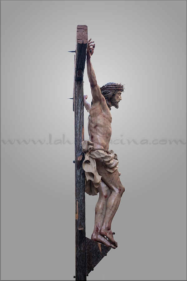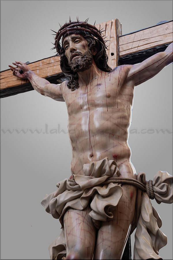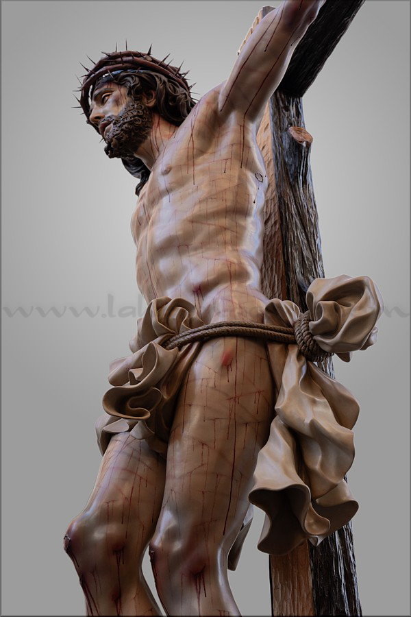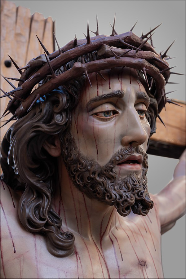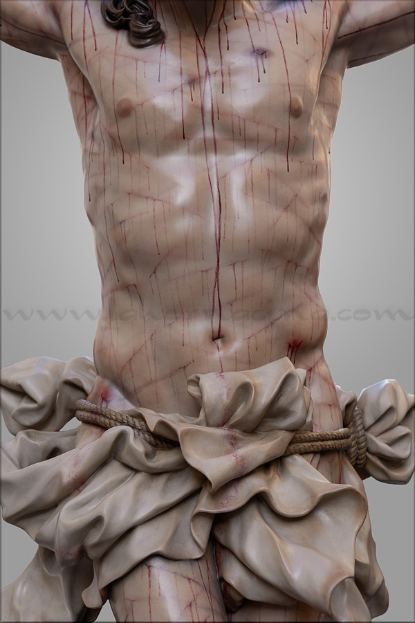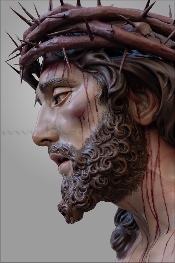 Cristo crucificado Obra realizada para Mellau (Austria) por encargo del sacerdote Thomas Huber. Es de tamaño natural (170 cm), representado vivo por expreso deseo del cliente, con la mirada frontal buscando el encuentro con los fieles. Ha sido tallado íntegramente en madera de cedro real, incluida la cruz de sección plana y rectangular a la que está sujeto con tres clavos. Este detalle, junto al amplio movimiento del sudario, obedece también a un requerimiento de Huber. En el resto de la composición el escultor e imaginero moronense tuvo plena libertad de creación. El Crucificado apoya los pies y el peso del cuerpo sobre el supedáneo. La corona de espinas, también tallada en cedro, forma parte del mismo bloque craneal, como suele ser habitual en Martín Nieto. La expresión de Jesús está trabajada con especial cuidado para invitar al silencio contemplativo y la oración profunda. La policromía, realizada completamente al óleo, está ejecutada mediante veladuras suaves que realzan con delicadeza los signos de la Pasión. El autor quiere expresar su agradecimiento a su equipo de trabajo: Juan José Fernández Almagro, Antonio Jesús Ángel Verdugo y su discípulo Gonzalo Quesada, así como a Jorge Cabrera por el excelente reportaje gráfico. |