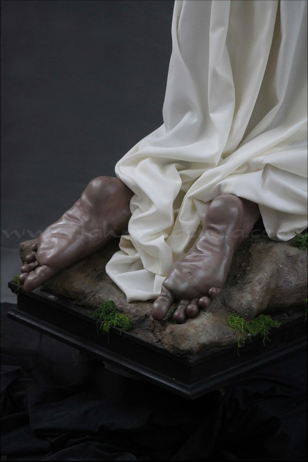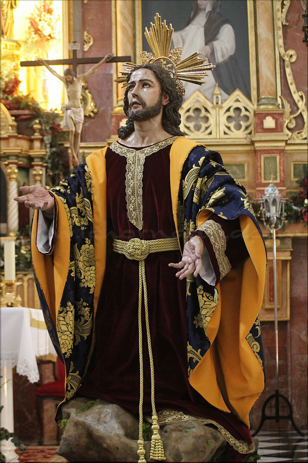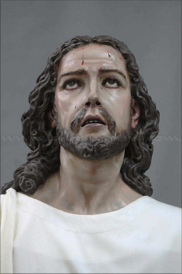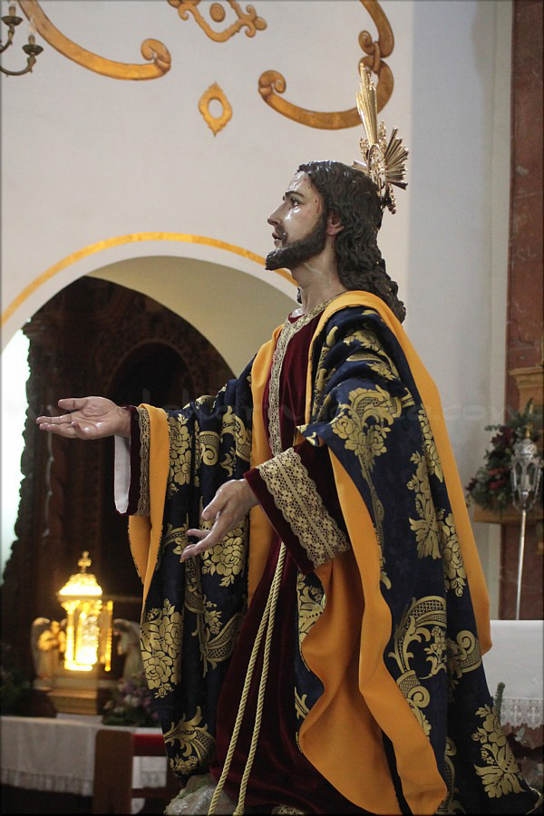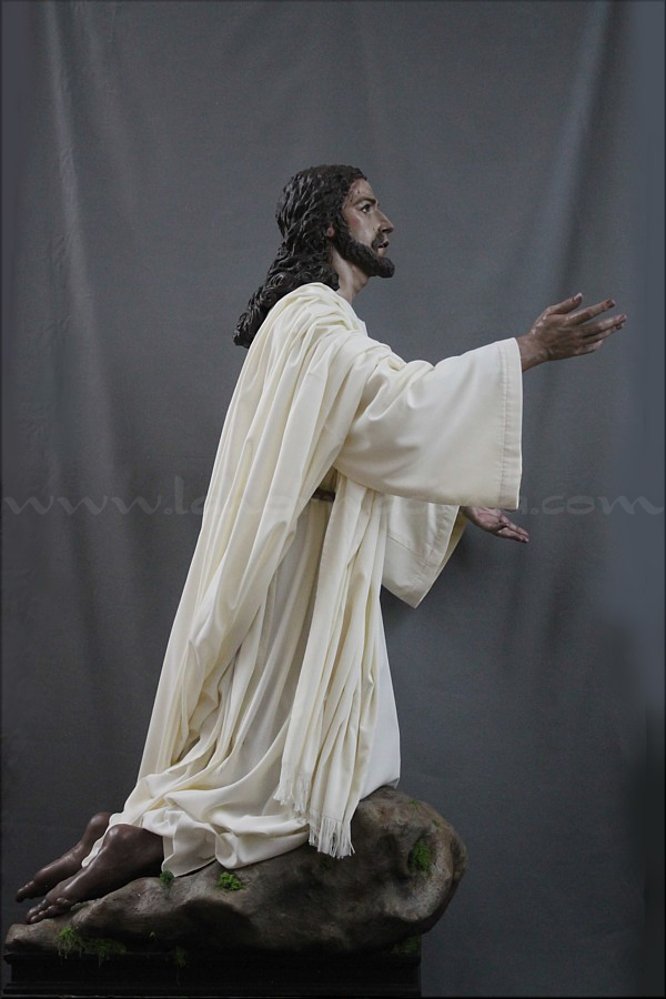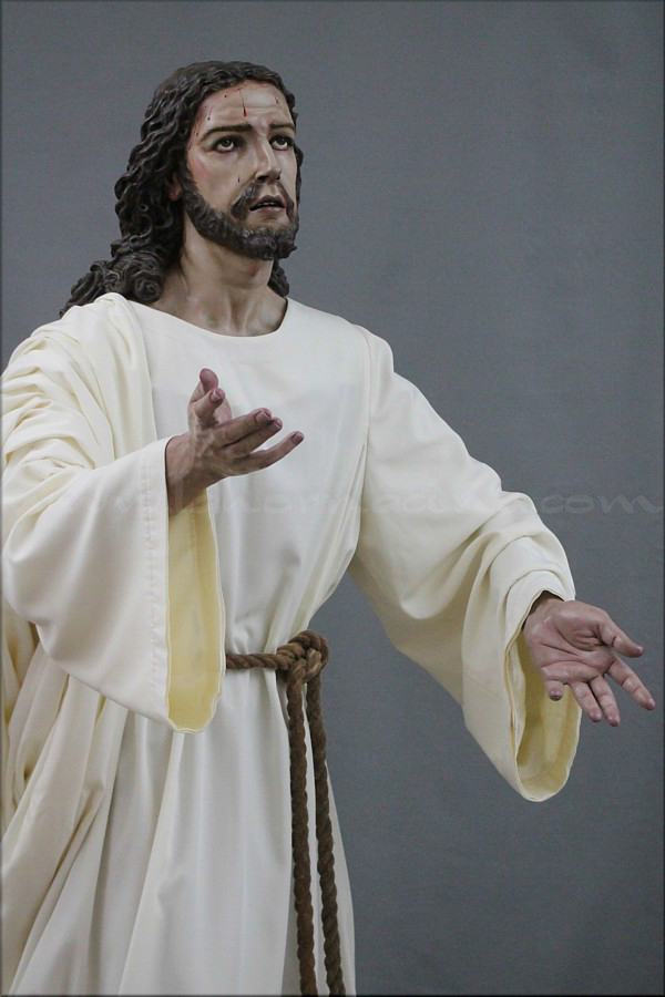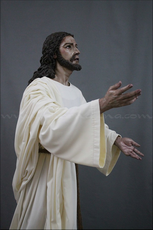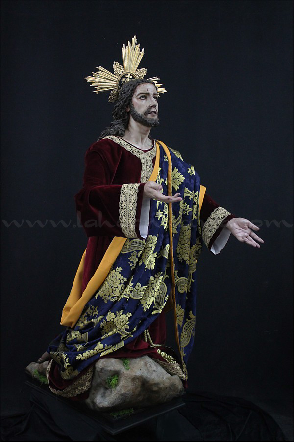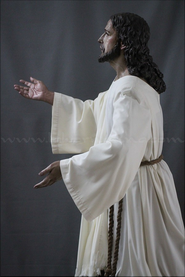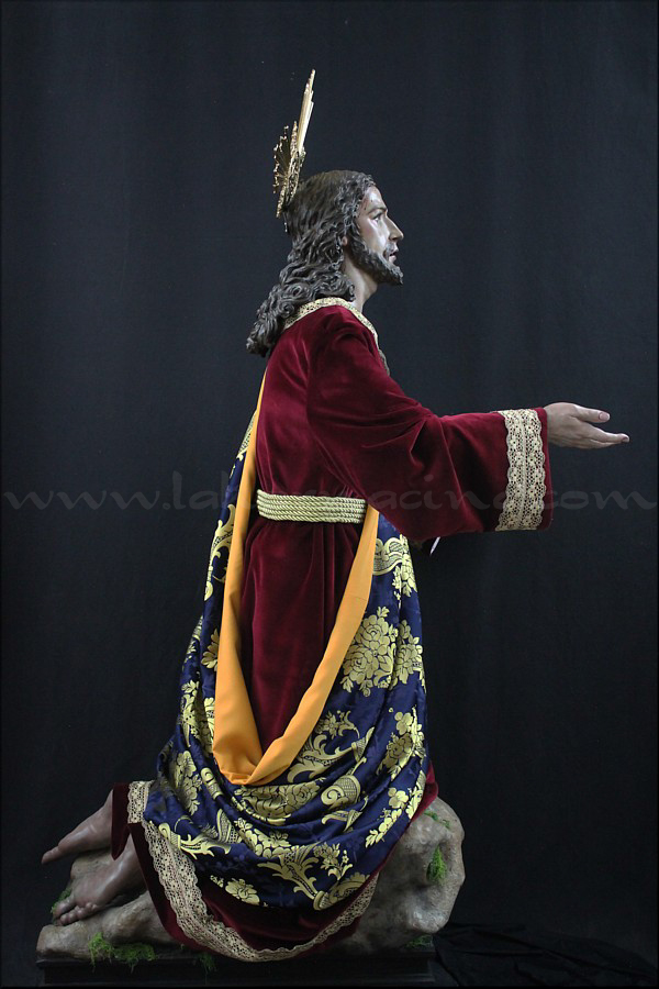 Santísimo Cristo de la Misericordia Talla en madera de cedro policromada para vestir, de 160 cm de altura, que representa el pasaje bíblico de la Oración en el Huerto. Obra encargada al artista torrevejense por la Cofradía de Nuestra Señora de la Soledad, de Rafal (Alicante), para convertirse en una de sus imágenes titulares. La elección de esta iconografía se fundamenta en el vínculo de la Soledad de María al pie de la cruz con la soledad de Jesús durante su oración en Getsemaní. Aunque no realizará la misma estación de penitencia ni en el mismo día que la Virgen de la Soledad, esta nueva advocación cristífera refuerza espiritualmente el sentido de la soledad como eje devocional de dicha corporación de penitencia. Su presentación y bendición ha tenido lugar hoy en el templo parroquial de Nuestra Señora del Rosario de la localidad. El autor plasma el tormento espiritual y emocional de Cristo, que lucha entre su condición humana y su misión divina, a través de la crispación anatómica y la expresión de angustia en su rostro. El sudor de sangre que brota de su frente y el gesto de súplica que dirige arrodillado hacia el Padre aumentan el dramatismo y la emoción de esta escena previa al arresto del redentor y capturan su conflicto espiritual mientras agoniza por su inminente crucifixión. |