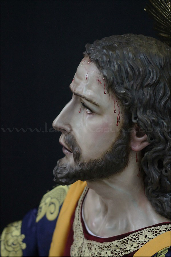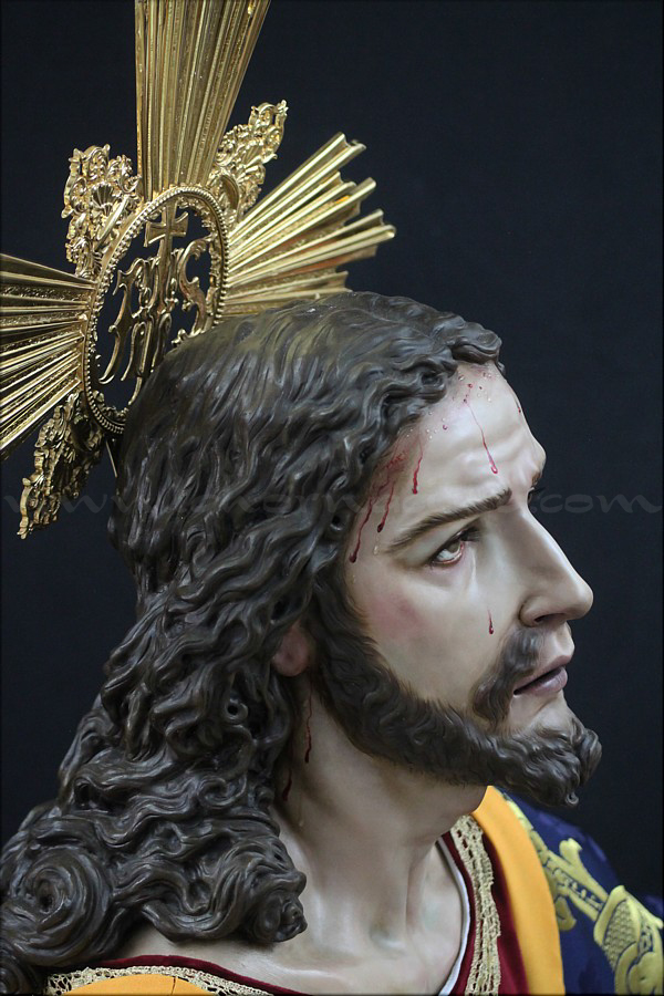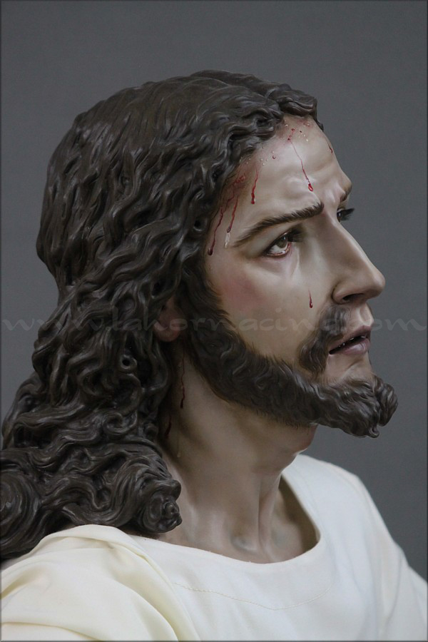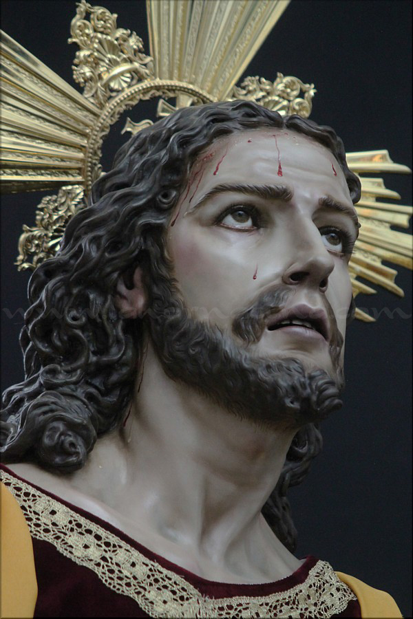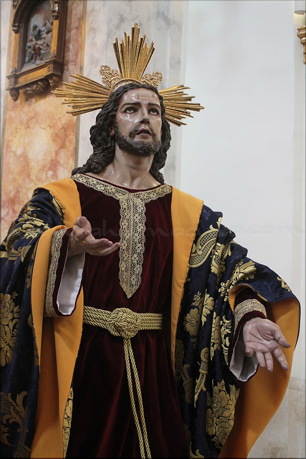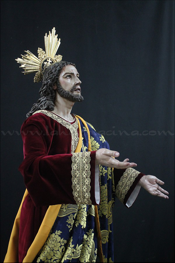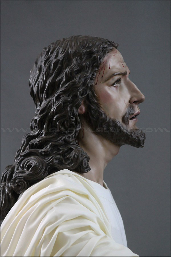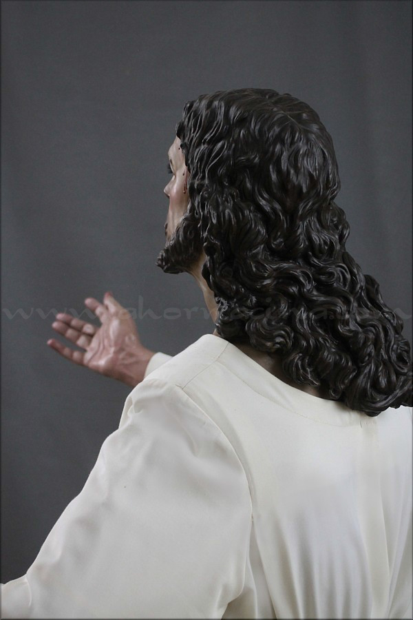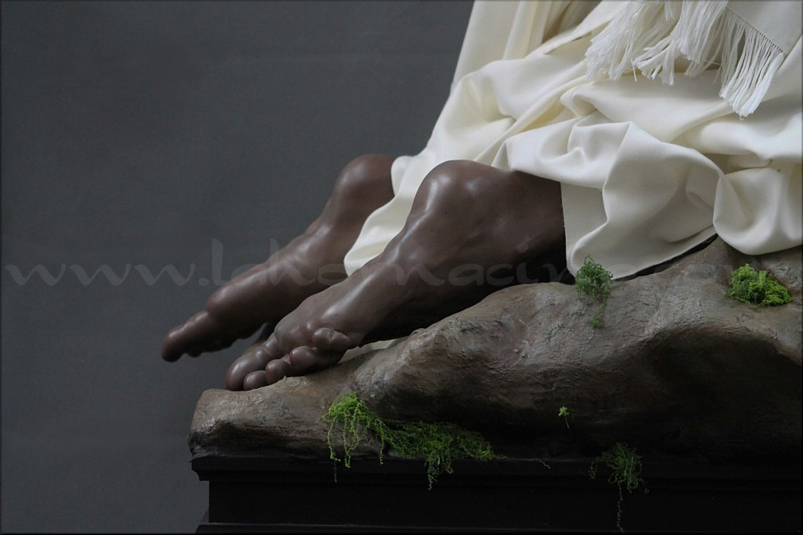 Santísimo Cristo de la Misericordia Talla en madera de cedro policromada para vestir, de 160 cm de altura, que representa el pasaje bíblico de la Oración en el Huerto. Obra encargada al artista torrevejense por la Cofradía de Nuestra Señora de la Soledad, de Rafal (Alicante), para convertirse en una de sus imágenes titulares. La elección de esta iconografía se fundamenta en el vínculo de la Soledad de María al pie de la cruz con la soledad de Jesús durante su oración en Getsemaní. Aunque no realizará la misma estación de penitencia ni en el mismo día que la Virgen de la Soledad, esta nueva advocación cristífera refuerza espiritualmente el sentido de la soledad como eje devocional de dicha corporación de penitencia. Su presentación y bendición ha tenido lugar hoy en el templo parroquial de Nuestra Señora del Rosario de la localidad. El autor plasma el tormento espiritual y emocional de Cristo, que lucha entre su condición humana y su misión divina, a través de la crispación anatómica y la expresión de angustia en su rostro. El sudor de sangre que brota de su frente y el gesto de súplica que dirige arrodillado hacia el Padre aumentan el dramatismo y la emoción de esta escena previa al arresto del redentor y capturan su conflicto espiritual mientras agoniza por su inminente crucifixión. |
