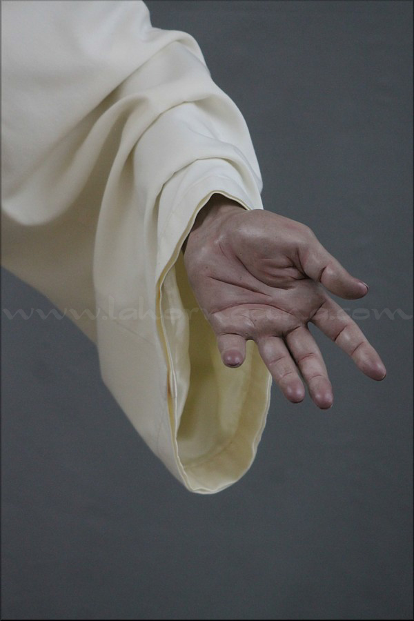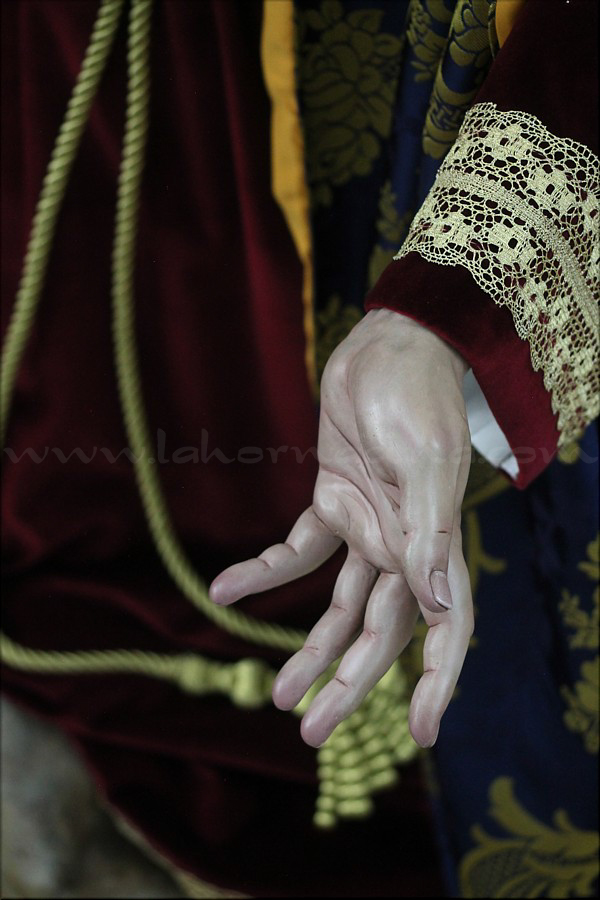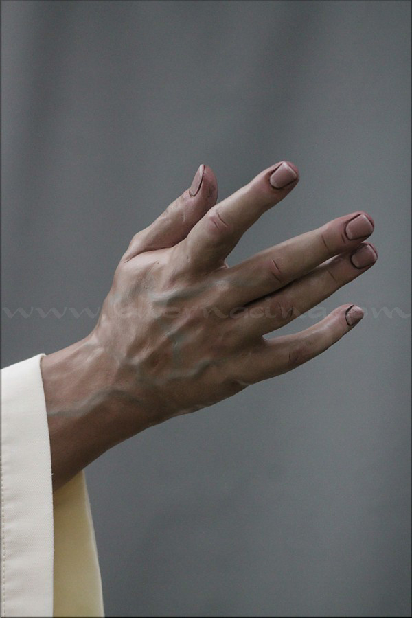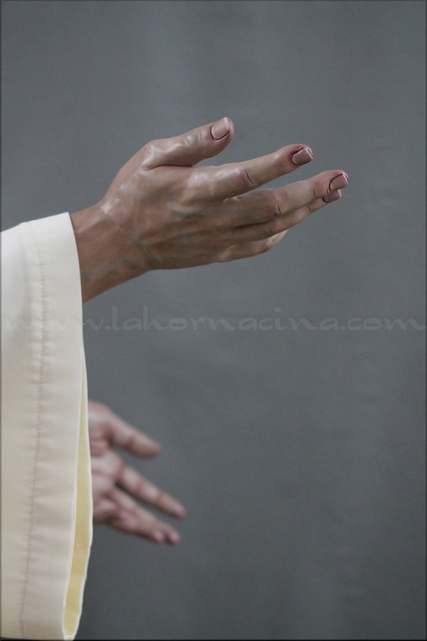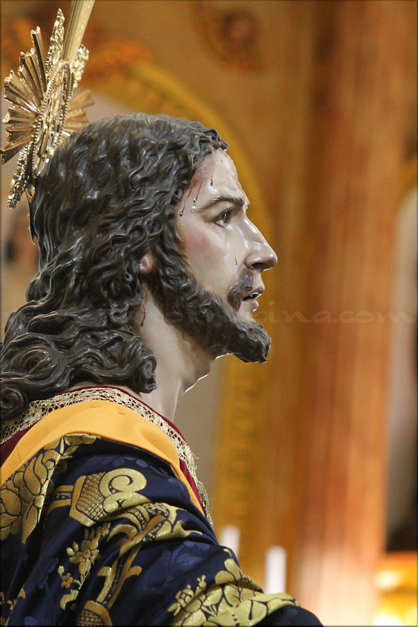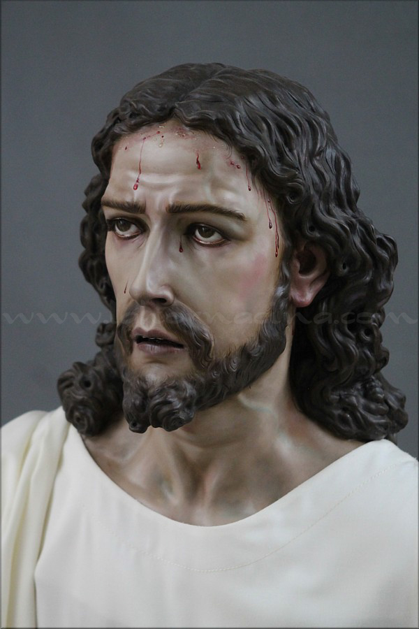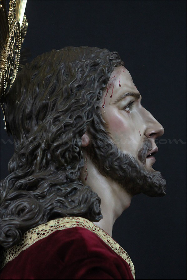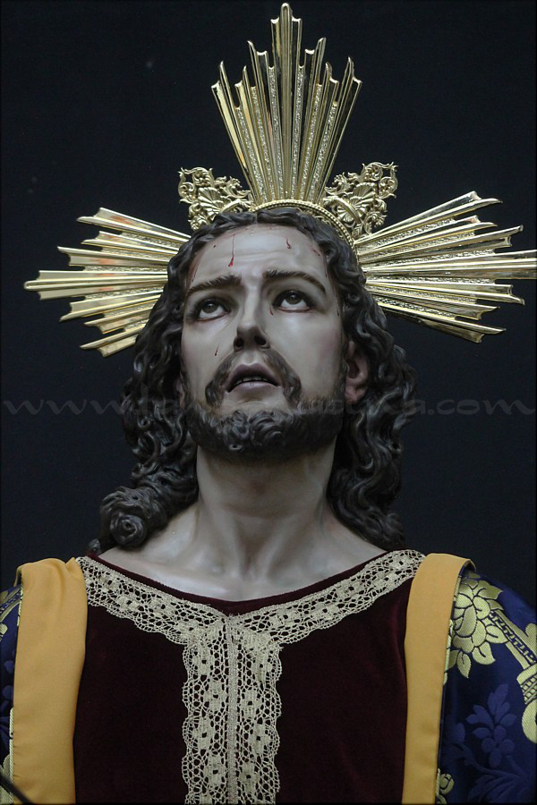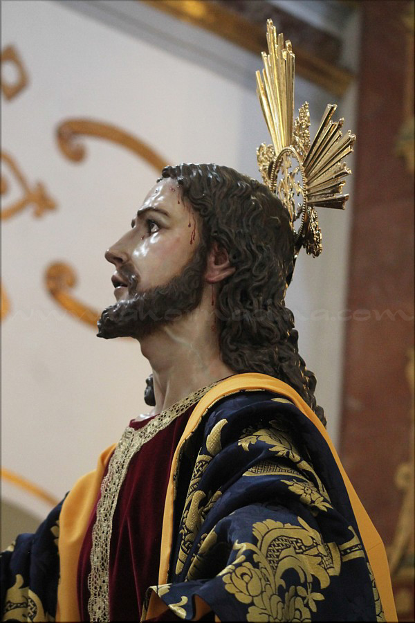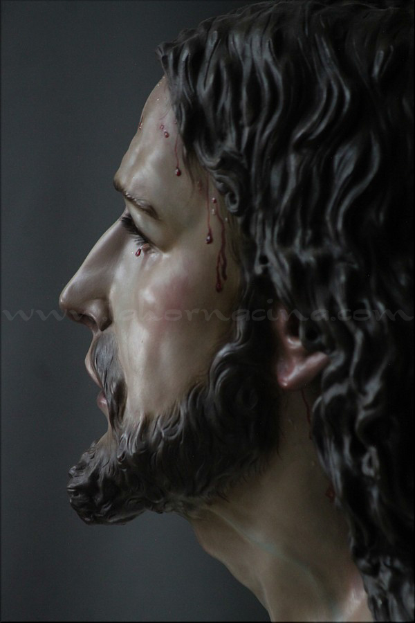 Santísimo Cristo de la Misericordia Talla en madera de cedro policromada para vestir, de 160 cm de altura, que representa el pasaje bíblico de la Oración en el Huerto. Obra encargada al artista torrevejense por la Cofradía de Nuestra Señora de la Soledad, de Rafal (Alicante), para convertirse en una de sus imágenes titulares. La elección de esta iconografía se fundamenta en el vínculo de la Soledad de María al pie de la cruz con la soledad de Jesús durante su oración en Getsemaní. Aunque no realizará la misma estación de penitencia ni en el mismo día que la Virgen de la Soledad, esta nueva advocación cristífera refuerza espiritualmente el sentido de la soledad como eje devocional de dicha corporación de penitencia. Su presentación y bendición ha tenido lugar hoy en el templo parroquial de Nuestra Señora del Rosario de la localidad. El autor plasma el tormento espiritual y emocional de Cristo, que lucha entre su condición humana y su misión divina, a través de la crispación anatómica y la expresión de angustia en su rostro. El sudor de sangre que brota de su frente y el gesto de súplica que dirige arrodillado hacia el Padre aumentan el dramatismo y la emoción de esta escena previa al arresto del redentor y capturan su conflicto espiritual mientras agoniza por su inminente crucifixión. |