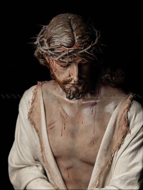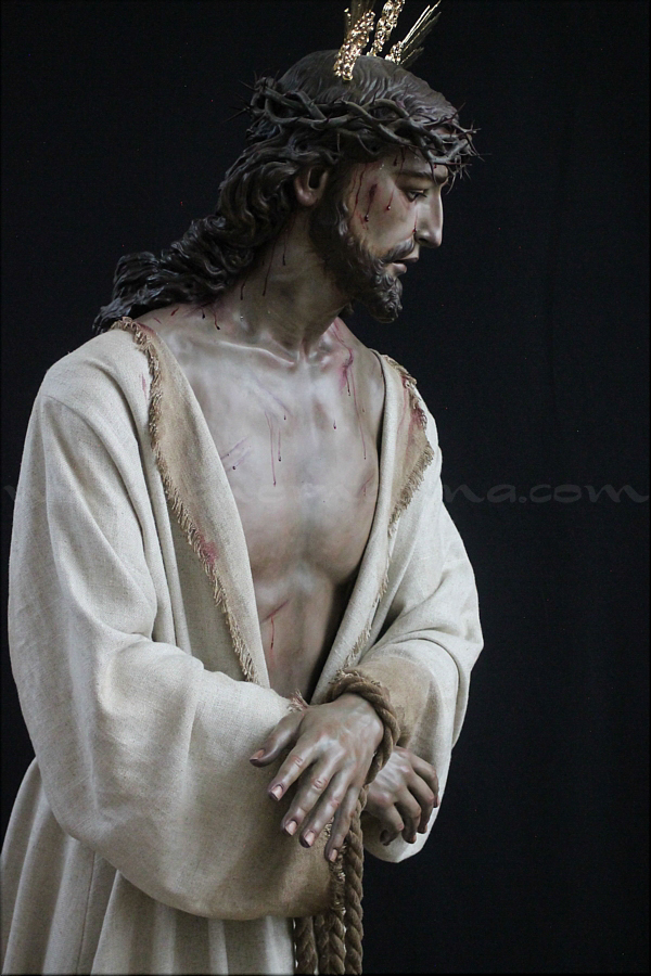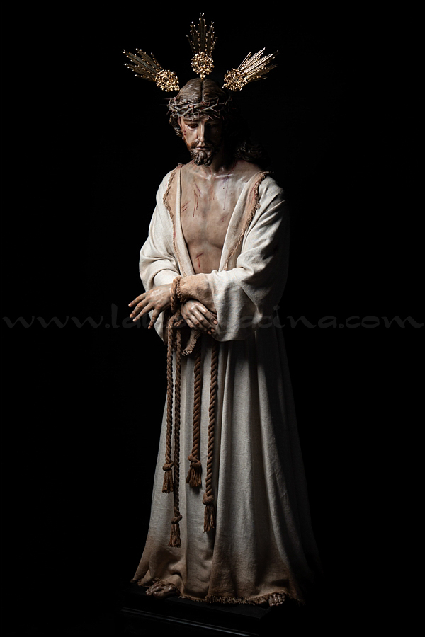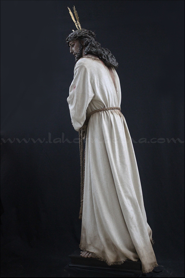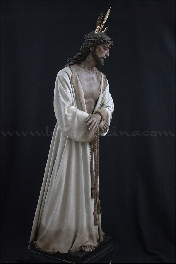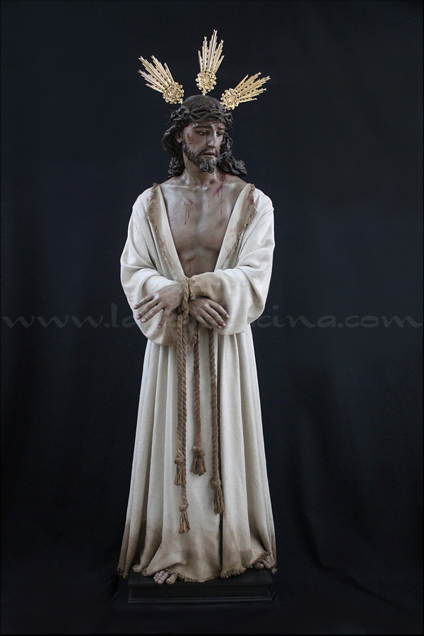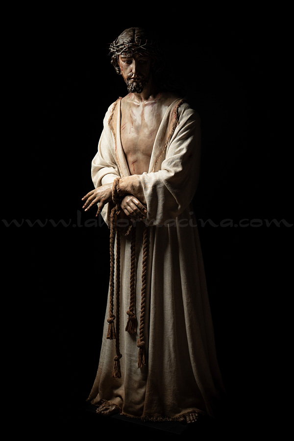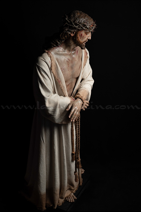 Señor de la Humildad (Jesús Cautivo - Sentencia de Cristo) Hoy ha sido presentada y bendecida en la localidad alicantina de Benejúzar la última obra del escultor torrevejense Víctor García Villalgordo. Se trata del Señor de la Humildad, imagen que formará parte del primer paso de misterio de la recién fundada Hermandad de la Sentencia. Este futuro conjunto procesional estará compuesto por cinco figuras y recreará el pasaje evangélico de Jesús en el momento de su sentencia de muerte. La talla del Señor ha sido realizada en madera de cedro real, alcanzando una altura de 170 cm, siguiendo los cánones clásicos de la imaginería procesional. Pese a la tragedia, el autor ha querido presentarlo por encima de ella, sin reaccionar ante la furia homicida de unos verdugos que lo condenan a muerte; pues como afirmó Sheed en una de sus apologías, estaba redimiendo a la raza humana, desarrollando una actividad incomparablemente mayor que la que cualquier otro hombre haya hecho nunca, entregado de lleno a la más grandiosa tarea jamás realizada en la tierra. El acto de bendición se ha llevado a cabo en el templo parroquial de Nuestra Señora del Rosario de Benejúzar, lugar donde, desde hoy, el Señor de la Humildad recibirá culto de forma permanente. La joven Hermandad de la Sentencia celebrará mañana una salida extraordinaria de la imagen por las calles de Benejúzar, con el objetivo de presentarla a sus vecinos y dar la bienvenida pública a este nueva representación de Jesús Cautivo. |