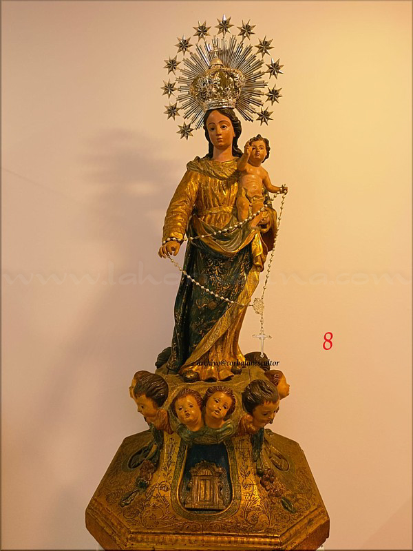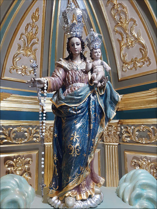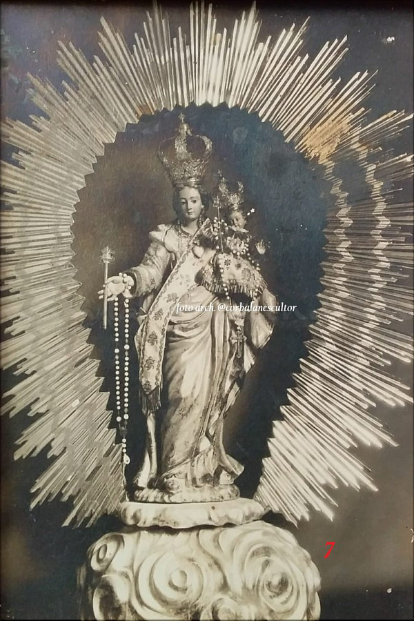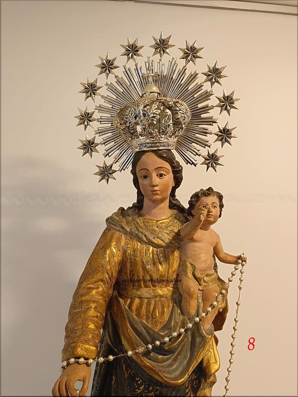 En cuanto a la intervención de 1878, Joaquín Eusebio Baglietto y Martínez (1829-1882), hijo del también escultor Santiago Baglietto, dejó testimonio de su intervención en su libro de encargos. Esta información la facilitaron los bisnietos del escultor, los señores Martínez Lapuente, a Francisco Candel Crespo. En este documento podemos leer claramente qué intervino el escultor y qué no, puesto que puntualiza el cambio de los ojos de cristal, giro de la cabeza, separación del niño respecto de la talla de la Virgen y el dorado completo de los ropajes para su posterior estofa. La construcción del actual templo parroquial, cuya titularidad tendría la misma Virgen del Rosario [2], dio comienzo en 1840 finalizando la obra en 1873. Este hecho motivó que, tras el traslado desde la pequeña iglesia donde estaba originalmente al camarín de la nueva parroquia, mucho más grande y de planta basilical, la patrona perdía protagonismo dado su escaso tamaño, así que se recurrió al antes citado escultor e incluso se le colocó una nube exenta para darle altura y un radial de ráfagas doradas en el contorno de Nuestra Señora [7]. |