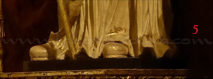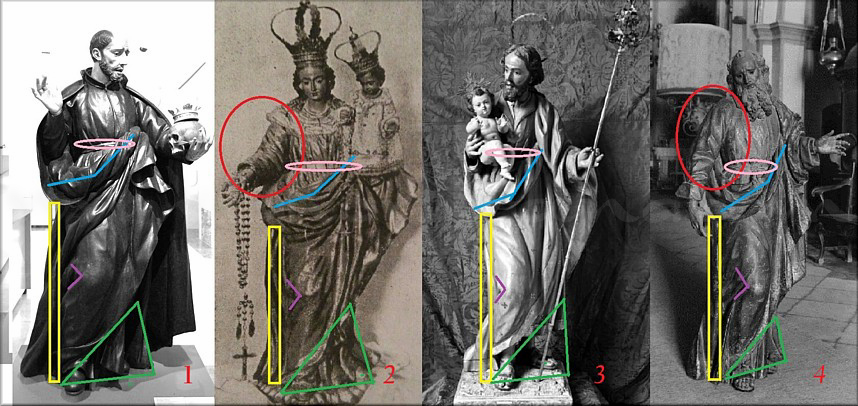 Desde ese momento y hasta 1936 la imagen no sufrió ningún otro tipo de intervención del que se tenga constancia. Ese mismo año, con el estallido de la guerra civil, fue escondida en el interior de una tinaja en la almazara de los Murcia, a escasos metros de la iglesia. Cuando la contienda finalizó la talla regresó al templo, y ya en 1965, con motivo de la coronación canónica, José Sánchez Lozano la intervino realizando una nueva talla del niño, sustituyendo al original que a día de hoy se conserva en la parroquia. En 1993, con motivo de las obras de reforma del templo, la Virgen vuelve a ser intervenida por el escultor Francisco Liza Alarcón. No obstante, estos dos últimos escultores no retallaron nada, solo se limitaron a una serie de repintes puntuales muy localizados, algunos de ellos perceptibles a simple vista. Todo indica que la obra solo ha sido modificada en los detalles que mencionó Baglietto dado que la fotografía más antigua que se conserva es de hacia 1880 [7], cuando ya había sido intervenida por el citado escultor, siendo esa misma fotografía testigo fiel de lo poco invasivas que fueron las dos que se realizaron ya en el siglo XX, puesto que la Virgen se muestra tal y como la vemos hoy en lo que a aspectos formales y estofa se refiere. Al entrar a analizar los aspectos estéticos y configurativos de la obra vemos que refleja todos los tecnicismos de las esculturas de bulto redondo de Nicolás Salzillo: el falso "contrapposto" por el cual sus obras extienden su brazo derecho, de forma que gira la cadera hacia la izquierda pero, sin embargo, vuelve a adelantar el pie derecho cuando el "contrapposto" se basa en contraponer una extremidad superior a la inferior contraria; esto es, adelantar o extender el brazo derecho y la pierna izquierda, atrasando el brazo izquierdo y la pierna derecha dando dinamismo compositivo. El llamado "pliegue escabel" es otro de esos detalles que repite y que puede apreciarse en obras que son claramente identificables dentro de la producción del napolitano, algunas de ellas documentadas. Este pliegue se localiza siempre en el lado derecho de la talla y, a pesar del movimiento de los ropajes, cae totalmente recto acentuando los volúmenes de dicha pierna, la cual adelanta. Podemos verlo en el San Joaquín de la parroquia de San Pedro [4] o el San José de la iglesia de San Miguel [3], ambas parroquias situadas en la ciudad de Murcia. |
