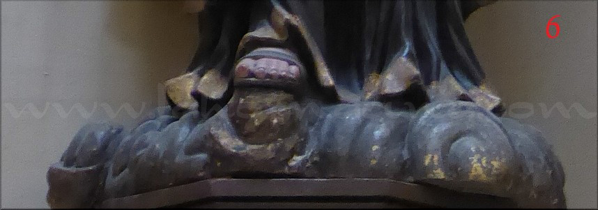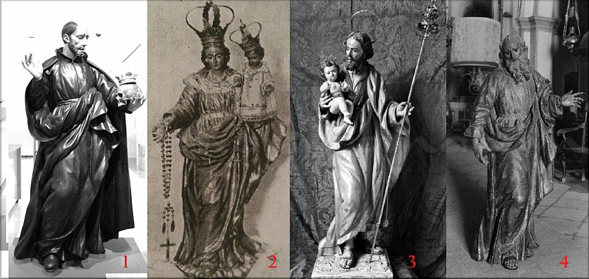 De esta manera sabemos que en estos años ya se venera una imagen de Nuestra Señora en el citado lugar. El porqué de la advocación lo encontramos en que Santomera dependía parroquialmente de la vecina Beniel, municipio cuyo patronato ostentaba también la Virgen bajo la advocación de Rosario. En el caso de Beniel sabemos que la advocación vino dada por la influencia de los dominicos, que se movían entre los conventos de Murcia y Orihuela, siendo tanto Santomera como Beniel puntos de parada obligada al hallarse justo en la frontera territorial entre Murcia y el Reino de Valencia. En cuanto a la atribución de Nicolás Salzillo, sabemos que la imagen de San Patricio [5], patrono de Murcia, fue realizado por el escultor napolitano en 1703, siendo un encargo del Concejo que aparece en las Actas Capitulares de ese mismo año. La talla tendría como destino la antigua sala capitular del Ayuntamiento de la ciudad. Pasando posteriormente a la ermita del Pilar y después a la Santa Iglesia Catedral de Murcia. También sabemos que Nicolás Salzillo trabaja para el desamortizado convento de carmelitas de la ciudad antes de 1720. De esa etapa y convento son las imágenes de San Joaquín [4], que actualmente encontramos en la iglesia de San Pedro, y la de Santa Teresa de Jesús [6], que encontramos en la iglesia de San Lorenzo. Casualmente todas estas obras poseen características similares en el tratamiento de la talla, composición, materiales y detalles, como la sección de nube de la citada Santa Teresa o los zapatos de San Patricio, que emparentan directamente a Nuestra Señora del Rosario de Santomera con esta primera etapa en la producción del autor. Nicolás Salzillo no doraba ni estofaba apenas sus imágenes, de ahí que en los años posteriores y bajo la influencia de su hijo Francisco se intentase adecuar las imágenes a los gustos de las posteriores décadas, dadas las influencias y reminiscencias del rococó, llevando a cabo repintes y estofas como en el caso de la Virgen del Rosario de Santomera, que fue intervenida por Joaquín Eusebio Baglietto en 1878. |