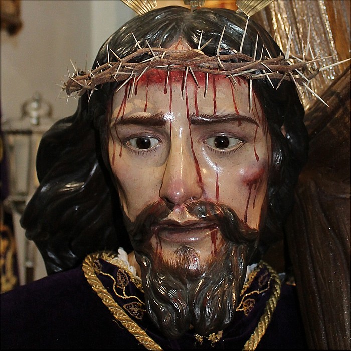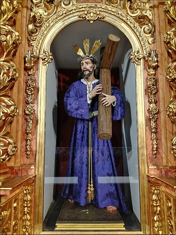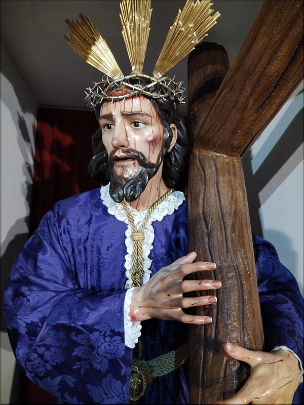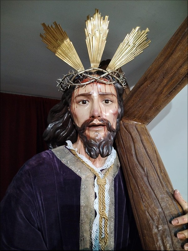 Se trata de una obra que puede ser de finales del siglo XVII (producción de Roldán) o inicios del siglo XVIII (obra de su escuela), siguiendo así los modelos y el estilo artístico del barroco sevillano que el escultor e imaginero sevillano difundió, y teniendo en cuenta que desde Sevilla llegaban a Montijo muchas obras y que los talleres hispalenses producían obras de alta calidad como la que nos ocupa. Junto a lo anterior, elementos como la serenidad expresiva, el tratamiento volumétrico del pelo, la estructura facial, el naturalismo y el dramatismo contenido, y la posición de manos y dedos son referencias que, sin estar dentro del grado de refinamiento de las obras autógrafas de Roldán, sugieren a Iglesias Aunión que debemos situar al Nazareno en el ámbito de su taller o de escultores directamente relacionados en su estilo con el maestro. Un taller que funcionó como un importante núcleo de gran actividad, en la que participaron numerosos discípulos y colaboradores, lo que ofreció la difusión de modelos homogéneos en amplios territorios La obra responde desde su tipología a los conocidos como nazarenos de vestir, con cabeza, manos y pies perfectamente tallados y policromados. La sensación de movilidad se manifiesta en la forma en que adelanta el pie izquierdo y la levísima inclinación a la altura de los hombres por el obvio peso de la cruz. Es una imagen ideada claramente para procesionar, encontrándonos ante un modelo que alcanzó notable difusión en la Escuela sevillana a partir del siglo XVII. |