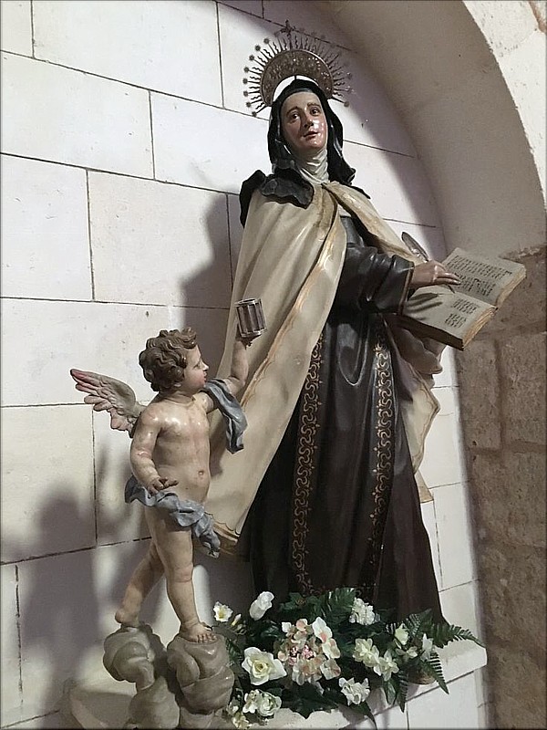Se trata de una escultura del siglo XVIII que tiene bastantes paralelismos con la producción del escultor e imaginero Luis Salvador Carmona (Nava del Rey, Valladolid, 1708 - Madrid, 1767). Fueron los historiadores Alberto C. Ibáñez Pérez y René Jesús Payo Hernanz los primeros en afirmar que podría haber sido ejecutada en el taller de este maestro. Esta escultura de Santa Teresa de Jesús del convento carmelitano de San José y Santa Ana en Burgos -la propia religiosa fundó el cenobio en el año 1582- es sumamente parecida a la que, sobre la misma iconografía, Salvador Carmona talló para la iglesia de Santa Marina en Bergara (Gipuzkoa) hacia 1741-1743, que hace también ademán de lanzarse a andar. La disposición del manto y el gesto también recuerdan a otra santa del maestro: la Santa Catalina de Siena del templo parroquial de El Salvador en Lagartera (Toledo). |