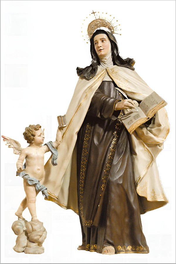 Asimismo, el plegado de los paños de la escultura burgalesa tiene unos enormes parecidos con los empleados por Salvador Carmona. En concreto, se evidencian bastantes similitudes con el sistema de pliegues que usó para la figura de la Inmaculada Concepción de Lesaka (Navarra). El angelito que porta el tintero de la mística de Ávila en el conjunto burgalés tiene muchos parecidos con los que talló el maestro para acompañar la figura de Cristo recogiendo las vestiduras del retablo de la Clerecía de Salamanca, el que figura junto al San Mateo de La Granja de San Ildefonso (Segovia) y los que acompañaban a la espléndida escultura de sor María Jesús de Agreda que guardan en Madrid las Religiosas Concepcionistas de La Latina, lamentablemente desaparecidos durante la pasada guerra civil. |