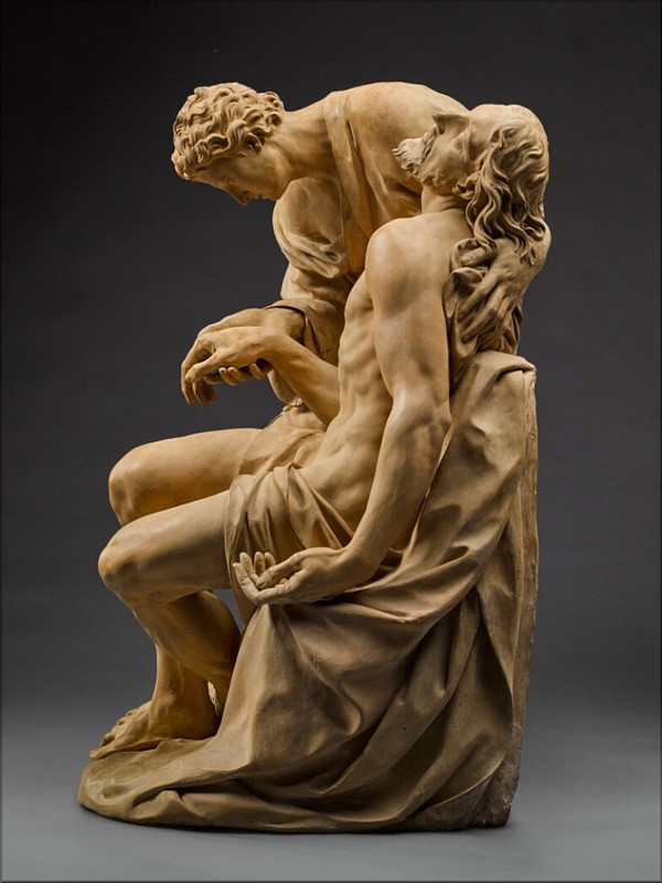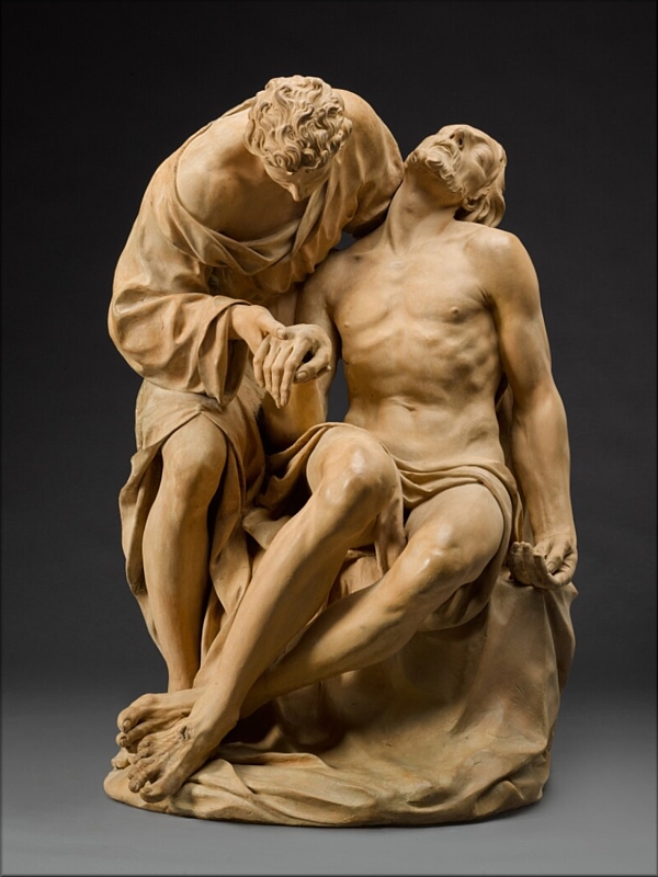 Este magnífico grupo de terracota con Cristo y San Juan Evangelista, localizado en el mercado del arte desde al menos el año 2001, ha sido recientemente atribuido por el historiador Andrea Bacchi al escultor italiano Antonio Trentanove (Rímini, 1745 - Carrara, 1812). Anteriormente, estaba atribuido a Gaetano Gandolfi, aunque se acerca más al estilo de su hermano mayor, Ubaldo, en particular por los afilados rasgos del rostro de Cristo. Sin duda, se trata de un trabajo realizado en el ambiente artístico boloñés del último cuarto del siglo XVIII. Recuerda al decisivo momento de 1780, cuando se documentan una serie de importantes personalidades: Luigi Aquisti, Petronio Tadolini, Giacomo Rossi, los citados hermanos Gandolfi (y posteriormente también Mauro, hijo de Gaetano) y por supuesto, Antonio Trentanove. Un momento clave, en el que algunos de los mencionados protagonistas de esa generación de escultores tuvieron la oportunidad de lucirse, se produjo en la iglesia boloñesa de San Julio, reconstruida y rápidamente decorada tras el terremoto de 1779. Dicho grupo de artistas en su totalidad, y aun sin marcar un punto de inflexión radical con respecto a la tradición del siglo XVII, indica claramente cómo el gusto general se dirigía del Barroco hacia un Neoclasicismo incipiente. Este vínculo con los predecesores de esa generación también se reconoce en este grupo, sobre todo por sus similitudes con un tondo de estuco fechado en 1712, obra primeriza de Angelo Piò, donde Cristo es sostenido por San Juan, y no por María. Precisamente, el estuco fue la gran especialidad escultórica de Trentanove, quien se formó en la Academia Clementina de Bolonia y trabajó durante sus años en otra Academia, la de Carrara, ciudad en la que murió. Trentanove desplegó su actividad en las regiones italianas de Emilia-Romaña, Toscana y Las Marcas. Su hijo Raimondo, también escultor, fue discípulo del francés Antonio Canova, máximo exponente de la escultura neoclásica. |