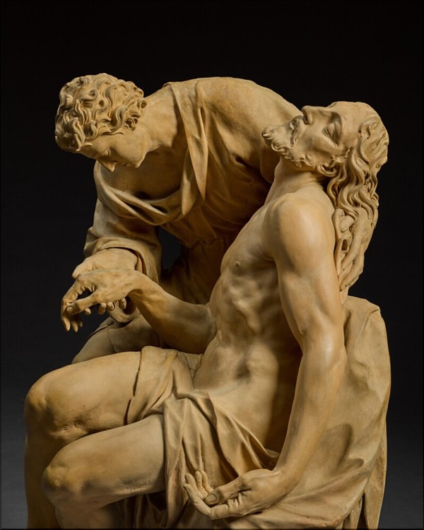 El lenguaje empleado para la realización de esta Piedad presenta sin duda gran afinidad con otras obras de Trentanove. En este punto, es importante mencionar el gran conjunto del "Bautismo de Cristo" (1794), realizado en estuco para el Duomo de Urbino, en el que encontramos las mismas fisonomías definidas, junto con una elocuencia serena y solemne de ejecución, en la que se pierde casi todo el énfasis barroco. La comparación entre los paños es también esclarecedora. Otra pieza relacionable es el "San Antonio Abad" (hacia 1778-1780) de la Colección de Arte del Ayuntamiento de Bolonia, atribuido a Trentanove en 1992 por Stefano Tumidei, quien lo identificó como obra indiscutible del artista. Al igual que esta Piedad, el San Antonio es una terracota muy refinada, de 78 cm de altura (la Piedad mide 72 cm). Ambas no deben considerarse modelos preparatorios, sino creaciones completamente terminadas. El mismo razonamiento es válido para el bajorrelieve del "Tránsito de San Jerónimo", conservado en el Oratorio de San Giovannino de Rímini, y ya consignado a Trentanove en documentos que obran en poder de la Cofradía de San Jerónimo, que lo datan antes de 1771, siendo un regalo del escultor en señal de gratitud por la ayuda económica recibida durante sus estudios en Bolonia. Este bajorrelieve es otro ejemplo de terracota perfectamente terminada, tanto en las anatomías desnudas como en los drapeados de ascendencia clasicista, típicos de Trentanove. El grupo aquí examinado de la Piedad con Cristo y San Juan Evangelista podría haber sido concebido como una pieza de devoción privada, quizá para ser colocada en el altar de una capilla familiar. La extraordinaria calidad del modelado destaca en partes como las piernas y el brazo izquierdo de Cristo, donde Trentanove desplegó todo su virtuosismo, o en elaboración de cada dedo de ambas extremidades. |