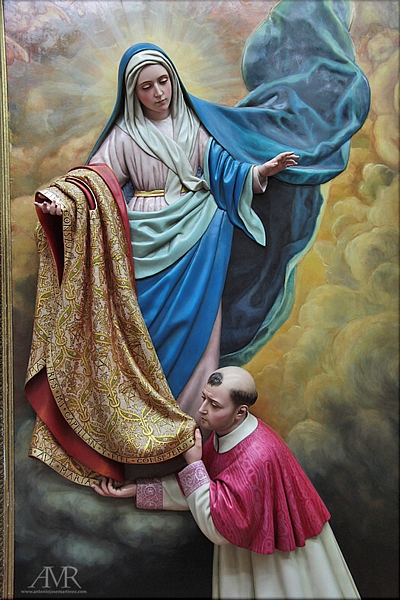 Ildefonso de Toledo, hijo de padres visigodos y sobrino de San Eugenio III, fue obispo de Toledo del año 657 al 667. Estudió en Sevilla, bajo la tutela de San Isidoro, y entró a la vida monástica en la orden de San Benito, huyendo de sus padres, unos nobles que se oponían a su vida sacerdotal. Posteriormente sería elegido abad de Agalia, en el río Tajo, cerca de Toledo. En el 657 fue elegido arzobispo de esa ciudad. Nombrado Doctor de la Iglesia, San Ildefonso unificó la liturgia en España, y escribió numerosas obras de carácter litúrgico y dogmático, particularmente sobre la Virgen María. En la iconografía que nos ocupa aparece arrodillado, recibiendo con inmenso fervor la vestidura traída del cielo. |