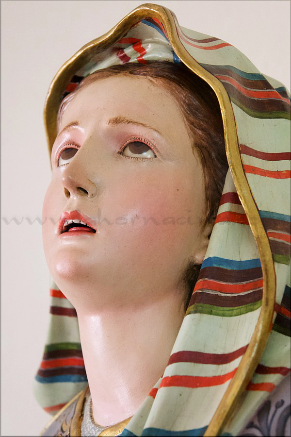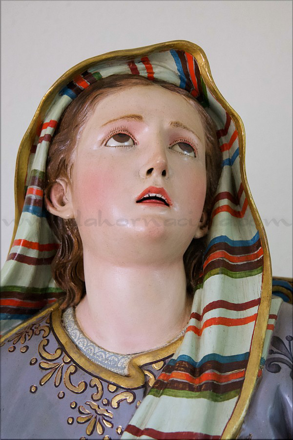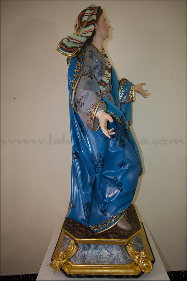 Esta talla en madera de tamaño inferior al natural, catalogada en el siglo XVIII, ha sido atribuida a Ignacio Vergara Gimeno (Valencia, 1715-1776), maestro escultor del barroco valenciano. Es propiedad de Juan Antonio Ferrer Juárez, que la cedió el pasado año a la Semana Santa de Benetússer para ser la Dolorosa titular de la Cofradía de María al Pie de la Cruz, siendo bendecida el 8 de marzo de 2025. Fue restaurada en 2024 por María de los Ángeles Pérez. En 1888 también fue intervenida, como consta en una inscripción al dorso de la peana, donde también dice que era propiedad entonces de Pedro José Pardo y Gomis. A falta de constancia documental, la atribución a Ignacio Vergara se basa en las semejanzas con otras piezas del artista, caracterizadas por la pose de marcado contraposto, la composición serpenteante y ese corte berniniesco tan característico en su producción, acusando una notable influencia de las esculturas napolitanas y genovesas que, de forma contemporánea a su hechura, llegaron a las costas mediterráneas. Los anteriores paralelismos ponen en relieve la intensa circulación de modelos a través de estampas y dibujos que tanto condicionó el desarrollo de la escultura en el siglo XVIII español, ejemplares de los que la familia de artistas Vergara, bien por su situación al frente de la Real Academia de San Carlos de Valencia, bien por la relación mantenida con otros artífices formados en Roma, debió de disponer con facilidad. |
