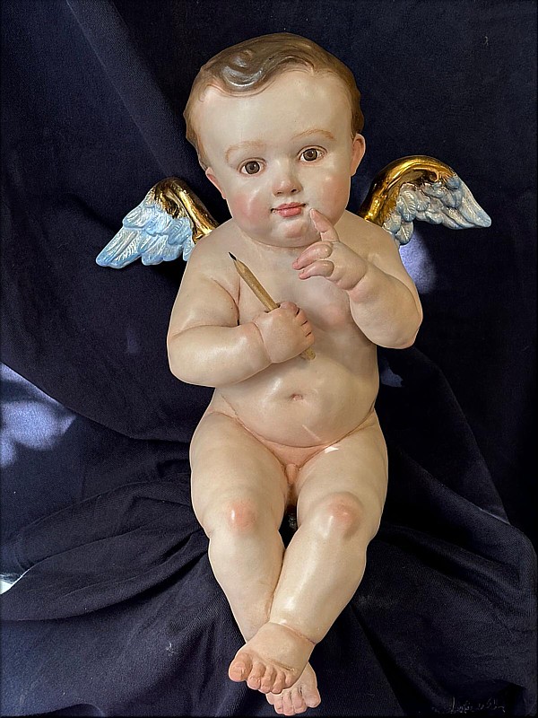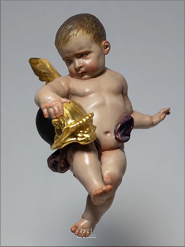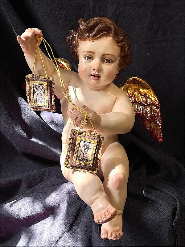 Carmen Bernal Esta pareja de ángeles realizada por la escultora e imaginera cordobesa completa las cuatro esquinas del paso de misterio de la Sagrada Lanzada de Elche (Alicante). Uno de ellos representa a la orden Carmelita, de ahí que porte un escapulario donde se puede ver, por un lado, la imagen de la Virgen del Carmen de San Cayetano de Córdoba, y por otro a Nuestro Señor de las Penas de Elche, como símbolo de unión entre las dos ciudades. El otro ángel porta un lápiz, haciendo un guiño a todos los niños y niñas que forman parte del Colegio de Nuestra Señora del Carmen de Elche, donde se ubica la Hermandad de la Sagrada Lanzada. Estos trabajos comenzaron en abril de 2025, desarrollándose a lo largo de todo el año. Las alas están doradas y plateadas por el dorador cordobés Rafael Barón. |