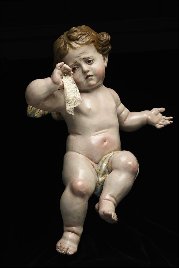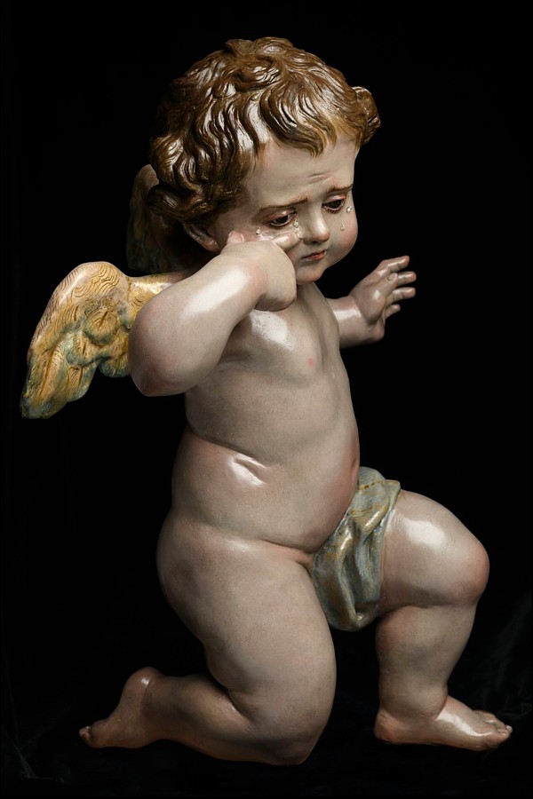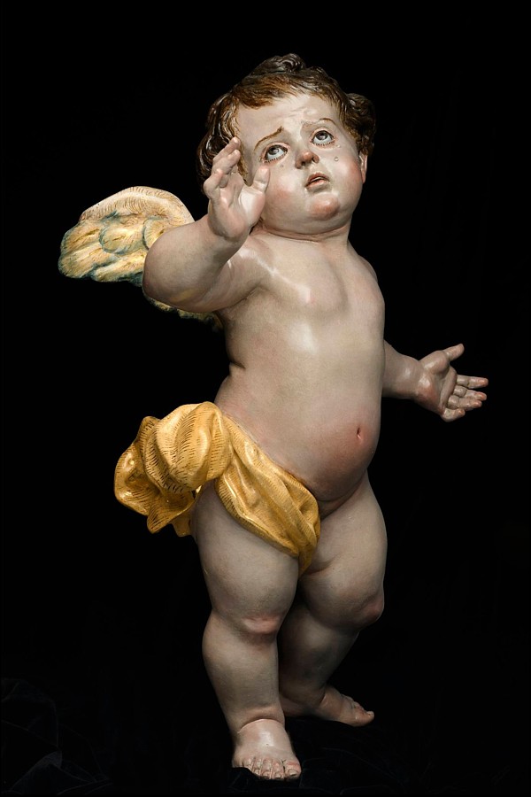 Hermanos Cava La primera pareja de ángeles sollozantes ha sido realizada por Juan y Sebastián Martínez Cava para procesionar a los pies de la Virgen de la Soledad de la Hermandad del Perdón (Murcia). Este encargo es un deseo que tenía dicha corporación de penitencia para completar, cada Lunes Santo, la escena de la popular dolorosa de José Sánchez Lozano, una imagen estrenada en 1943 para sustituir a otra de la misma advocación atribuida a Salzillo. Son dos obras talladas en madera de cedro y policromadas al óleo, con ojos de cascarilla de cristal policromados desde el interior y lágrimas de cristal. Medirían 48 cm si se encontraran de pie. Han sido diseñados teniendo en cuenta la composición piramidal que crea la línea del manto de la Virgen de la Soledad, de ahí que se haya creado casi un efecto espejo, con los ángeles sentados a los pies de la imagen. Ninguno de ellos mira a la Virgen, pero la acompañan entristecidos en su soledad. Son una manifestación de la cercanía del Señor a María en ese momento de dolor. Respecto a los ángeles realizados para la Hermandad de Nuestra Señora de los Dolores, patrona de Aljucer (Murcia), presentan características similares a los anteriores: su destino es acompañar a la popular dolorosa de Juan González Moreno, estrenada en 1940, y ambos son tallas completas en madera de cedro, policromadas al óleo, con ojos y lágrimas de cristal en sus mascarillas, alcanzando en este caso los 50 cm de altura, aproximadamente. |