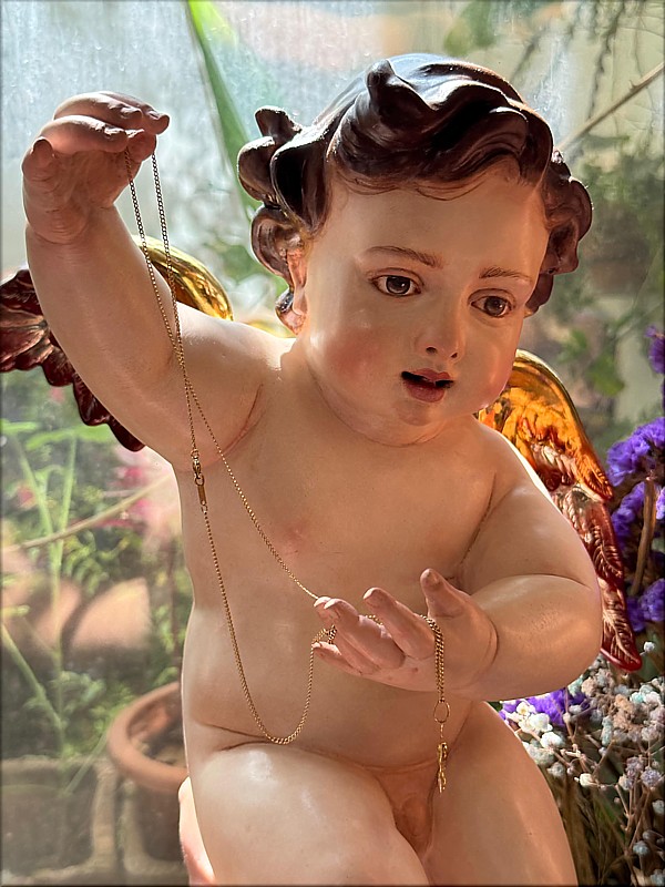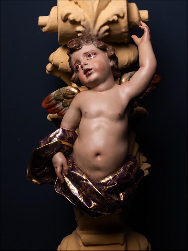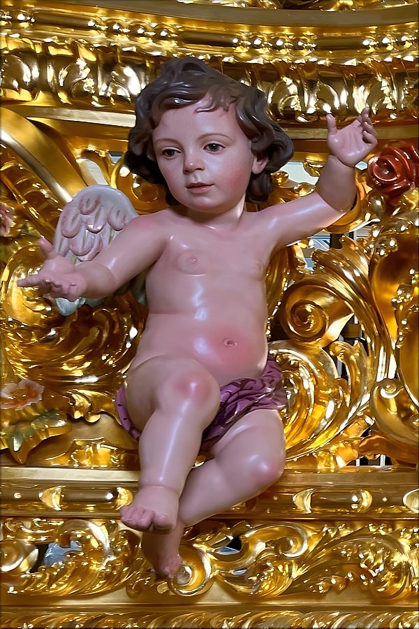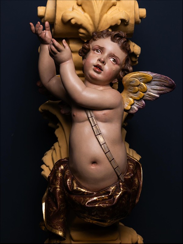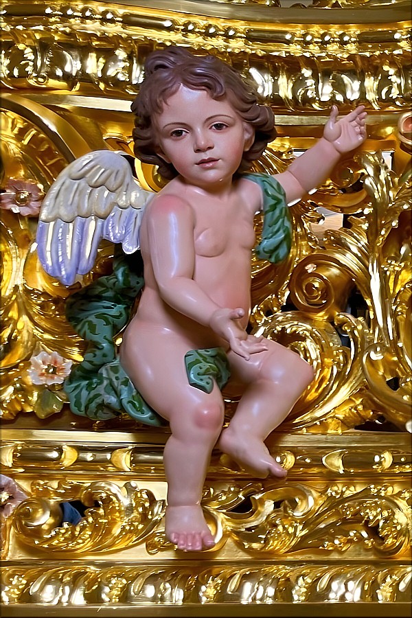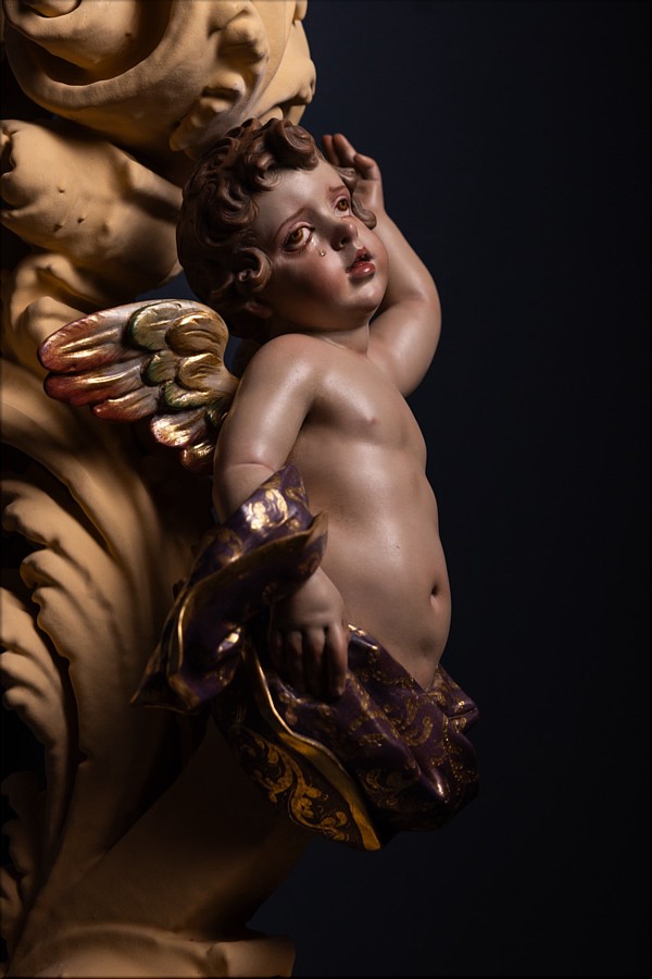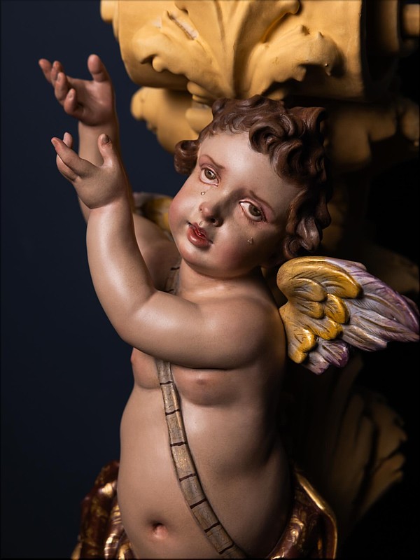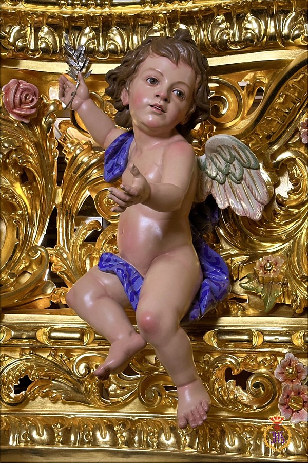 Álvaro Abrines Estas piezas forman parte de la primera de las tres fases que conforman el ambicioso proyecto patrimonial de culminación del paso procesional del Santísimo Cristo de la Sed (Sevilla), siguiendo el modelo original diseñado por Manuel Guzmán Bejarano y Antonio Dubé de Luque. El proyecto cuenta con el tallista Francisco Verdugo, el dorador Paco Pardo y el escultor e imaginero Álvaro Abrines. Esta primera fase ha comprendido a reforma de los candelabros, ahora dotados de nuevos anclajes que aportan mayor estabilidad y una mejor integración estética en el conjunto; la ejecución de nuevas cresterías, concebidas con absoluto respeto al diseño original del paso, y la incorporación de cuatro nuevos ángeles tenantes en los candelabros, que enriquecen el discurso iconográfico de la obra. Los arreglos estructurales y la talla de las nuevas cresterías han sido realizados por Francisco Verdugo, el dorado por Paco Pardo y la imaginería, de bulto redondo y policromada, por Álvaro Abrines. Cada uno de estos trabajos ha sido desarrollado bajo la coordinación y supervisión de Javier Escudero. Según el referido proyecto, la segunda fase comprenderá la ejecución de doce cabezas de querubines para la canastilla del paso, y en la tercera fase se llevará a cabo la repolicromía de los grupos de cabezas de querubines repartidos por los respiraderos. Está previsto que las actuaciones culminen en el año 2028. |