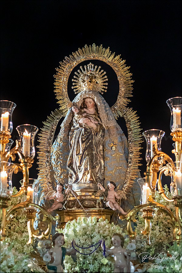 Nuestra Señora del Socorro (Rociana del Condado) Imagen de candelero para vestir del año 1577, obra manierista de la Escuela sevillana con policromía barroca, probablemente de mediados del siglo XVIII cuando le colocaron ojos de cristal. Fue restaurada por Francisco Buiza en 1977. El Niño es una pieza posterior de inspiración montañesina, fechada en 1650, que fue restaurado por Álvarez Duarte tras sufrir un acto vandálico en 1996. Su nuevo paso procesional, iniciado en 2023, todavía se encuentra en fase de ejecución por el tallista Óscar Caballero. Es una obra en madera de cedro que cuenta con unas dimensiones de 200 x 320 cm. Posee canasto de planta sinuosa, candelabros de seis luces, moldurón de 10 piezas y un alzado con tacón, bocelón, escocia y cuello de paloma, todo ello tallado en estilo barroco, con profusión de hojas de acanto, y actualmente en proceso de dorado por Daniel Sánchez. |