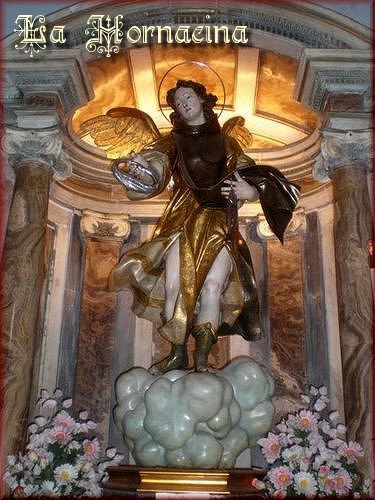 Retablo de San Miguel Arcángel, realizado en el siglo XVIII siguiendo el estilo rocalla tan habitual en su época. La imagen titular es también del Setecientos y se atribuye al genovés Francesco Maria Galleano. |