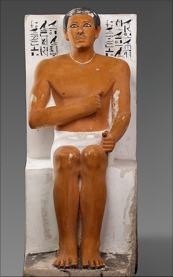 Esta estatua sedente del hermano de Keops forma pareja con la de su esposa Nofret. Fue creada entre el 2613 y el 2589 a.C., en el periodo de transición entre la Tercera y la Cuarta Dinastía. Junto con el marrón rojizo del cuerpo, color con el que se solía representar a los hombres porque pasaban mucho tiempo al sol, y los ojos de gran realismo, con incrustaciones de cristal de roca y calcita, llama la atención el bigote por lo insólito; de hecho, fue una moda muy efímera en el Antiguo Egipto, donde los varones, sobre todo los de clases altas, se afeitaban todo el vello, incluyendo el pelo de las cejas. Lo que vemos en pinturas, estatuas o relieves es todo maquillaje. La excepción era cuando se lo dejaban crecer por un periodo de luto, que en Egipto duraba meses.
