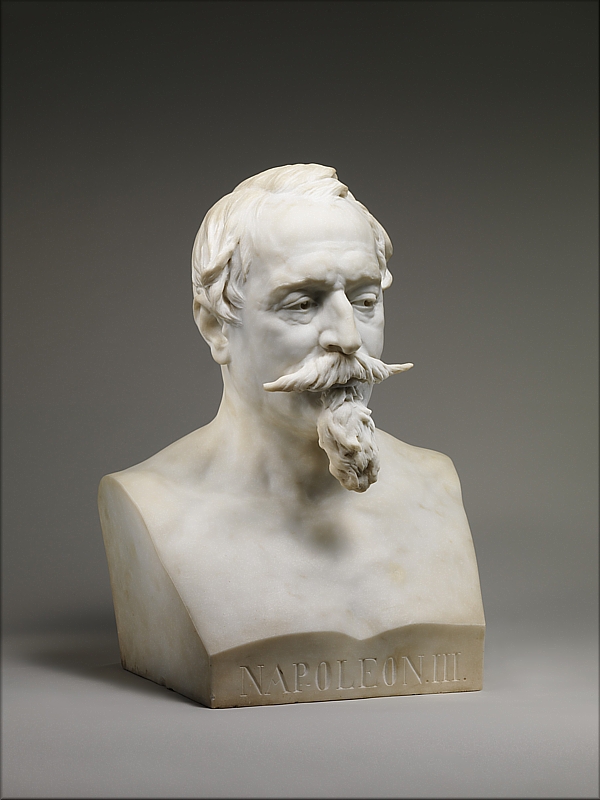 Jean-Baptiste Carpeaux, el escultor más exitoso de su época en Francia, cultivó asiduamente el favor de la familia imperial para obtener el honor de retratar a sus miembros. En el caso de Napoleón III, terminado póstumamente en Inglaterra, es uno de los retratos más conmovedores y magistralmente ejecutados del preeminente escultor del Segundo Imperio, quien solo pudo realizar bocetos del emperador tendido en su féretro el 13 de enero de 1873, fecha inscrita en el busto.