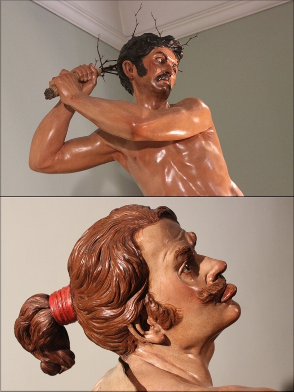 Injustamente calificado como obra menor de Francisco Salzillo durante mucho tiempo, aunque queda fuera de toda duda la colaboración de discípulos en su ejecución, hoy en día el espléndido grupo escultórico de la Flagelación o de los Azotes, integrante de la famosa procesión de la Cofradía de Jesús, disfruta de una feliz revalorización por parte de la historiografía. Salzillo solía realizar las figuras de los verdugos bajo una concepción plenamente dinámica del Barroco, de talla completa y ataviados con los típicos ropajes murcianos del siglo XVIII, con agitados escorzos y fieros aspavientos teatrales, siendo frecuentes los bigotes en sus rostros. En este paso los vemos en uno de los dos sayones que flagelan y en el que aparece tumbado en el suelo en actitud burlesca hacia Jesús.