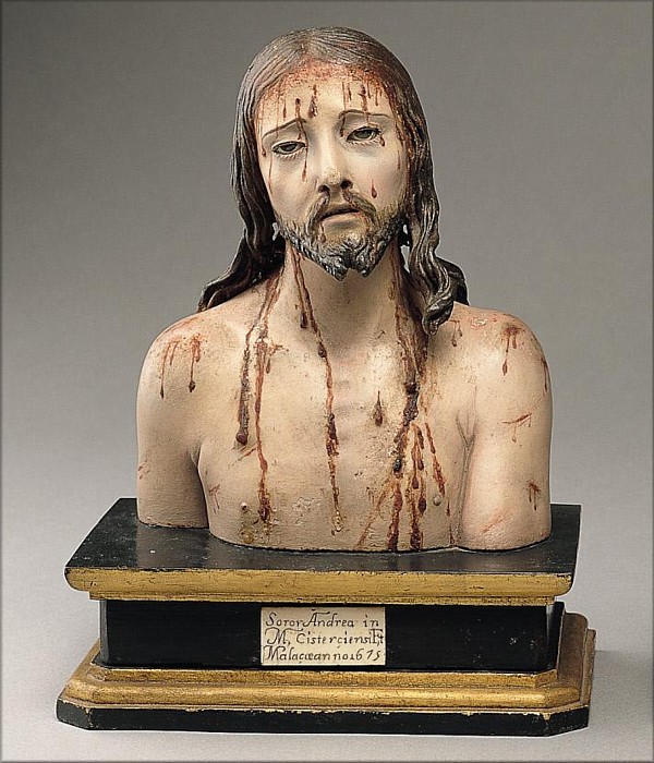 Andrea de Mena Como muchas otras mujeres artistas del siglo XVII, Andrea de Mena no podía firmar contratos en su propio nombre ni actuar como profesional independiente. Hija del escultor Pedro de Mena, pudo desempeñar un papel destacado trabajando en el taller paterno y más tarde en el malagueño convento cisterciense de Santa Ana. En 1675, la artista realizó Mater Dolorosa y Ecce Homo, una pareja de estatuillas que representan la angustia de la Virgen y el sufrimiento de Cristo, revelando que no dejó de tallar después de convertirse en monja. |