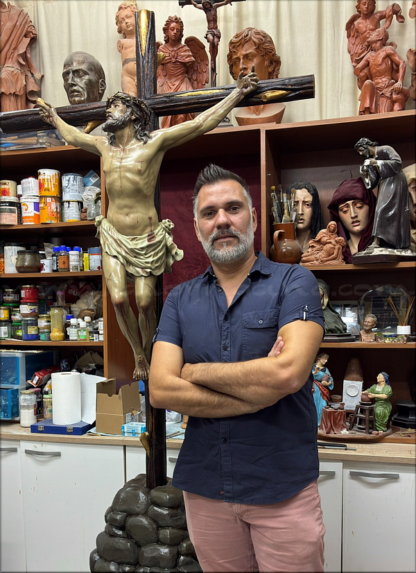 Vamos a empezar por lo que habitualmente suele ser el final, cuéntanos en lo que estás trabajando ahora. Ahora mismo estoy haciendo unos altorrelieves para una hermandad de Huéscar; terminando un Crucificado, de tamaño un poco inferior al natural, para el Santuario de los Milagros de Amil, en Moraña (Pontevedra); una Dolorosa para acompañar a mi Ecce Homo de La Mancha; una copia de la Virgen del Rocío de Almonte, de 1 metro de altura, para una colección particular y estoy empezando una imagen de San Juan Evangelista para el misterio del Traslado al Sepulcro de Vejer de la Frontera. También tengo varios ángeles y relieves para Málaga, San Fernando y otros sitios. Y después tengo algunos proyectos que estoy esperando a ver si se van a empezar este año o más adelante, así como algunos proyectos más grandes, pero de todo esto aún no se puede decir porque no hay nada firmado. Precisamente los ángeles y los relieves están entre tus esculturas más recurrentes al ser imaginero que trabaja para el taller sevillano Hermanos Caballero, especializado en pasos procesionales. Desde mis principios, prácticamente, porque yo empecé aprendiendo a cortar la madera con los Hermanos Caballero, una cosa muy importante para nuestro oficio ya que en las escuelas no lo enseñan; tienes que ir a un taller especializado en la talla en madera para aprenderlo. Desde entonces tenemos gran vinculación y amistad. Me cogieron muy pequeño y tenemos un trato casi de familia, de tantos años siendo amigos. Suelo colaborar con ellos realizando la imaginería de los pasos, excepto con las hermandades que tienen un imaginero predefinido. Consideras entonces fundamental para la formación de un escultor-imaginero el pasar por un taller. Quienes piensan lo mismo dicen que no solamente hay que aprender lo artístico, sino también lo técnico, especialmente la labor de carpintería, que hoy en día incluso está olvidada. Para un escultor o imaginero, pienso que es más importante, fíjate lo que te voy a decir, que la escuela; que es también importantísimo, por supuesto, porque la enseñanza es más amplia y hay muchas cosas en las que un escultor debe formarse. Pero hoy en día es que hay un problema, que pocos imagineros tallan. Incluso algunos te dirán que tienen tres o cuatro gubias en su taller, porque en realidad no las usan. Con la máquina de sacado de puntos digital parece que la escultura se ha limitado solamente a modelar y policromar, y yo pienso que eso es un error. La escultura, sobre todo la imaginería, siempre ha consistido en sacar el volumen de una pieza de madera, quitando o añadiendo material. Hoy en día te encuentras muy pocos que lo hacen, casi ninguno. Yo sí lo trabajo, aunque también utilizo la máquina porque, evidentemente, tengo que competir con el resto, no podría hacerlo todo tallado a mano, pero siempre tengo alguna pieza que estoy tallando en directo. Ahora mismo tengo otro Crucificado, también de 1 metro de altura, para la colección particular de un sacerdote, que estoy haciendo también en talla directa. Cada vez que tengo oportunidad, aprovecho para hacerlo así, porque pienso que eso es la esencia del escultor. Se puede decir que siempre te reservas un cupo de obras para realizar en talla directa. Sí, porque a mí es lo que me llena. Me gusta mucho más la madera que el barro. El barro también me encanta, pero la madera es un material precioso y especial. Ver cómo va saliendo la talla, la imagen, de la madera, es la esencia del escultor, del imaginero. E insisto que hoy en día creo que está muy perdido. ¿Nos dices algunos ejemplos? La talla de San Lucas para Sevilla. También el Cristo de la Caridad de Vejer de la Frontera está hecho en directo, excepto la cabeza, porque hice un modelo de cabeza para presentarlo a la Hermandad, aunque está totalmente transformado. Por poner algunos ejemplos más, algunas de mis Dolorosas y los cuatro Arcángeles de la Hermandad del Santo Entierro de La Palma del Condado (Huelva), los que van en el paso del Traslado al Sepulcro. A grosso modo se podría decir que hay dos corrientes: una que piensa que el modelado, o sea la creación del artista, se limita al boceto en barro, siendo lo demás un proceso puramente técnico, y otra que piensa que, desde el barro hasta el último toque de pincel, constituye una labor creativa del escultor. Es que tú puedes prescindir de un modelo de barro para hacer una talla de madera, pero no al contrario. Para tener una imagen de madera no tienes por qué pasar por el barro, la puedes tallar directamente sin el modelo en barro; de la otra forma, no se podría hacer. Si hablamos de imágenes de madera, es esencial que el artista sepa dominar perfectamente la talla. Después hay que contar con la ayuda de las máquinas, porque si hay mucho volumen de trabajo es normal que se tenga que recurrir a los recursos que tenemos y nos facilitan el trabajo, pero de una forma ordenada. Lo que no se puede es abusar de máquinas digitales. Ya es que prácticamente ni se modela, sino que se digitaliza un cuerpo, te lo sacan en madera y tú ahí no has hecho prácticamente nada, terminación y poco más con el raspín y la lija y a policromar. Eso no es la escultura sacra, nos estamos equivocando y estamos tirando este arte por tierra. Ese es mi punto de vista y respeto, por supuesto, la opinión de los demás. No quiero decir que modelar en barro no sea importantísimo también, todo lo que abarca la labor de una imagen es importante, pero la talla se ha dejado mucho de la mano, casi no se habla ya de ella, y yo creo que es un problema que tenemos. |
