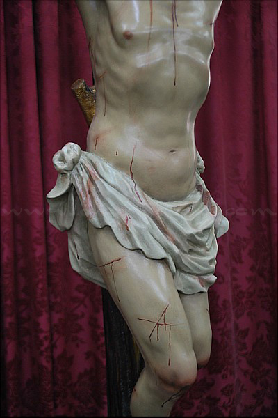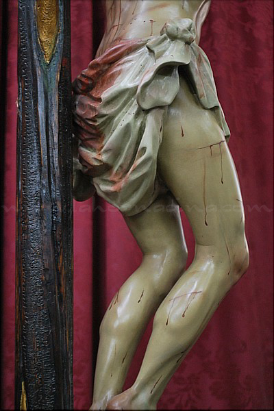 Crucificado para el Santuario de los Milagros de Amil, en Moraña (Pontevedra). Obra del escultor e imaginero sevillano que presentamos en La Hornacina. Mide 85 cm de altura, tallado de pies a cabeza en cedro policromado y policromado al óleo, con cruz arbórea y peana imitando el monte Calvario. Lleva como atributos corona de espinas de acacias y potencias doradas por Orfebrería Castilleja. Ha sido realizado para el presbiterio del Santuario sin advocación concreta, representado agonizante en la cruz y dispuesto de forma que mire hacia donde se encuentra la imagen mariana.