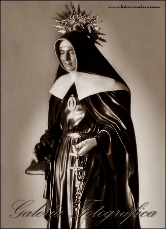 Ana Josefa Pérez Florido, conocida con el nombre religioso de Madre Petra de San José (1845-1906) nació en la localidad malagueña de Valle de Abdalajís y fue fundadora de la Congregación de Madres de Desamparados bajo la protección de San José de la Montaña. Comenzó su labor al servicio de los más necesitados en 1873, emitiendo sus votos temporales ocho años más tarde en la parroquia veleña de San Juan Bautista, templo donde ha sido bendecida y recibirá culto esta imagen del artista Alejandro López Aragüez. El autor, natural de Vélez-Málaga y afincado desde hace años en la ciudad de Sevilla, ha querido resaltar con este simulacro la absoluta entrega de la religiosa, su disponibilidad y su amor a los niños y a los ancianos, eje central del quehacer de su congregación fundacional. La Madre Petra de San José falleció con fama de santidad en Barcelona, el 16 de agosto del año 1906. Fue declarada Venerable por el Papa Pablo VI y beatificada en Roma por el también ya Beato Juan Pablo II en el año 1994. La presente obra, realizada en diversos materiales -predominando la madera y las telas encoladas- mide 150 cm de altura, sin contar los atributos de orfebrería. Se alza de pie sobre una peana de base cuadrada, con cierto aire de movimiento en su actitud. Baja su mirada a los fieles que la contemplan, ofreciéndoles a estos la cruz del Santo Rosario en su mano izquierda, como signo inconfundible de Dios. La Madre Petra de López Aragüez se nos muestra como una buena mediadora entre Dios y los hombres. En su mano derecha, apoyado a la altura de las caderas, porta un libro o breviario para sus oraciones con el que, al mismo tiempo, se ayuda para recoger su capa. En el pecho luce el original escudo de la Congregación de Madres Desamparados y San José de la Montaña, centrado por la imagen de la Virgen de los Desamparados, patrona de Valencia. Todo su hábito es negro a excepción del tocado blanco que enmarca el rostro. |