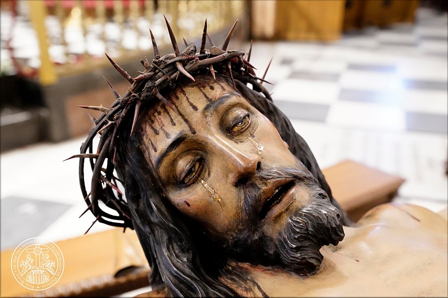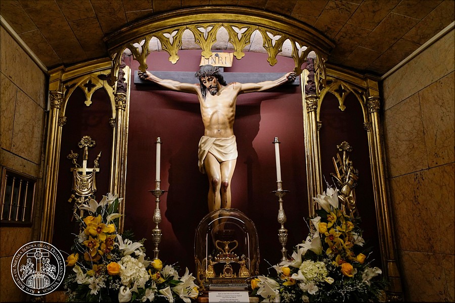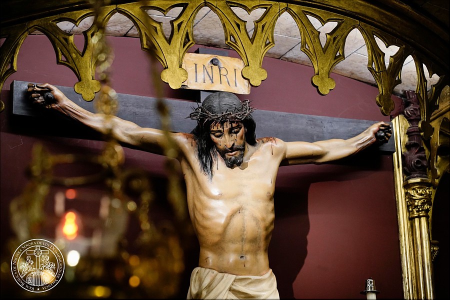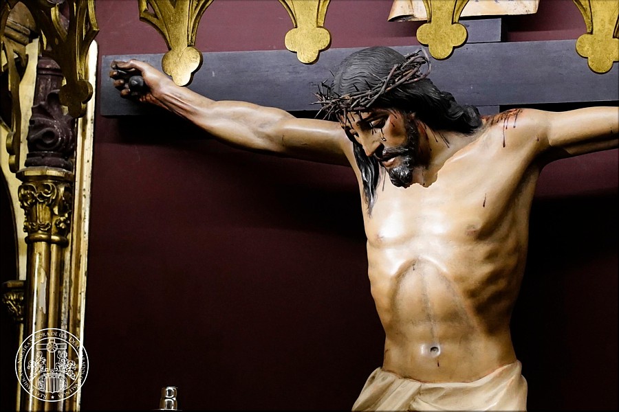 Gracias a esta restauración, especialmente al proceso de limpieza, el Cristo ha recuperado el esplendor y frescura de la sangre de las heridas, camuflada por los restos del betún y repintes, además de recuperar en la zona de la cruz la firma de su autor, el escultor e imaginero valenciano José María Ponsoda Bravo. En 1939 figura documentado este Cristo, que fue encargado a Ponsoda por el capellán mayor José Garín, a quien se debió también la decisión de confiar a Ponsoda la restauración de la imagen original de la Virgen de los Desamparados. El Cristo sustituye a una escultura quemada en 1936, conocida por una estampa fotográfica. La obra de Ponsoda, de tamaño académico, y correcta anatomía, no constituye propiamente una recreación de la efigie perdida en 1936, de considerable antigüedad, denotando el estilo personal del maestro, influido en este caso por la escultura castellana en madera policromada de los siglos XVI y XVII, y la tradición académica. El Cristo del Feliz Tránsito o "Cristo de la Coveta" recibe este apodo por conservarse en la capilla subterránea de la basílica, situada debajo del camarín de la imagen de la Virgen de los Desamparados. |