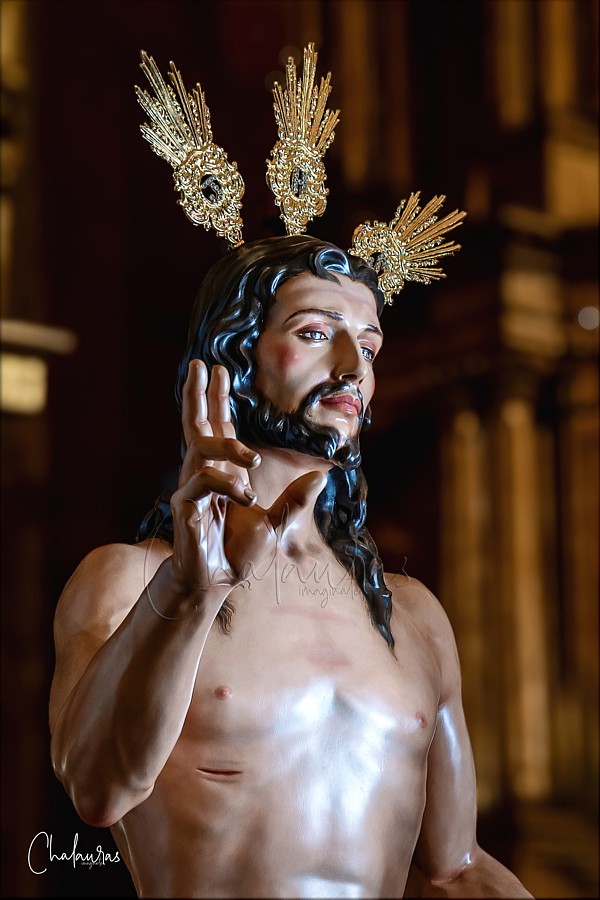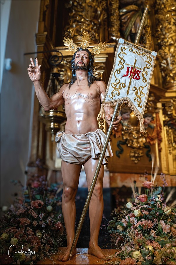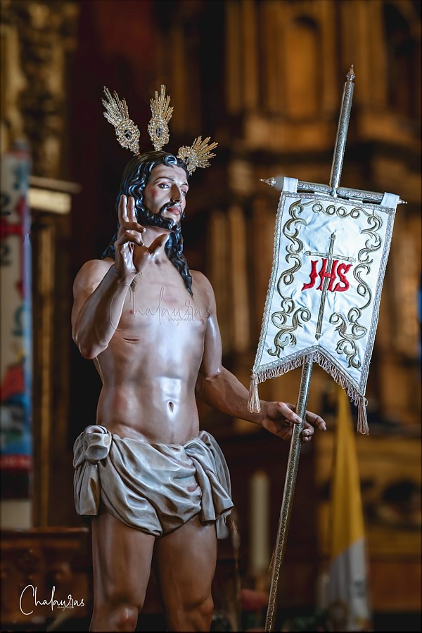 Jesús Resucitado Obra encargada al escultor e imaginero sevillano Juan Antonio Blanco Ramos por dos corporaciones de penitencia de Fuenlabrada (Madrid), la Hermandad Penitencial de la Santa Pasión y la Hermandad del Santísimo Cristo de la Misericordia, con el fin de recuperar una iconografía destruida durante los disturbios de 1936, cuya imagen era conocida como el "Cristo de los tres torreznos" porque la celebración del Domingo de Resurrección tenía lugar en la localidad desayunando torreznos acompañados de pan, huevos y jamón. Se representa la figura de Cristo, transfigurado y saliendo del sepulcro. La nueva imagen, a tamaño real en madera policromada, se inspira en la desaparecida en la Guerra Civil, sobre todo en la postura con el brazo derecho extendido mientras bendice al pueblo y el izquierdo sosteniendo un banderín blanco con las siglas JHS, símbolo de su victoria sobre la muerte. Por el contrario, los rasgos faciales, la disposición del cabello sobre los hombros, la resolución anatómica y del sudario, y la policromía, son característicos del estilo de Blanco Ramos. |