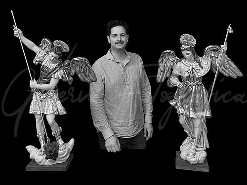 | San Miguel y San Rafael Estas obras forman parte de un conjunto escultórico compuesto por las imágenes de San Rafael, San Miguel, San Gabriel y el Santo Ángel de la Guarda, cuyo destino son las esquinas del paso procesional del Señor Amarrado a la Columna del municipio cordobés de Cabra (Hermandad de la Columna y Caridad). Todas estas imágenes se realizaron y presentaron en madera de cedro real en la cuaresma de 2019; sin embargo, debido a la pandemia del COVID-19, se retrasó el acabado total de las mismas. Este año se han finalizado las tallas de San Rafael y San Miguel y el próximo año 2027 está previsto que se finalicen las otras dos. Los arcángeles San Rafael y San Miguel tienen las encarnaduras acabadas al óleo. Sus ropajes combinan los dorados en oro fino y oro blanco con los estofados de temple al huevo, siguiendo diseños de estilo barroco y técnicas tradicionales de estofados y mateados para así realzar el dorado. Todo el proceso ha sido realizado por el escultor e imaginero cordobés en su estudio, desde el diseño de las imágenes hasta el modelado, pasando por la talla, las policromías y los estofados. Por último, comentar que estas imágenes han sido talladas en madera de cedro real con una altura de 80 centímetros. |