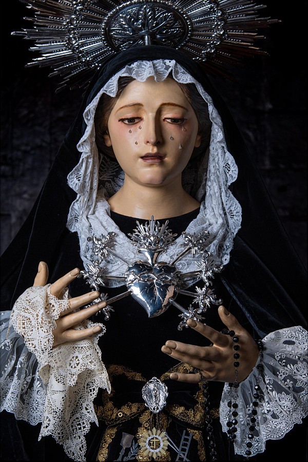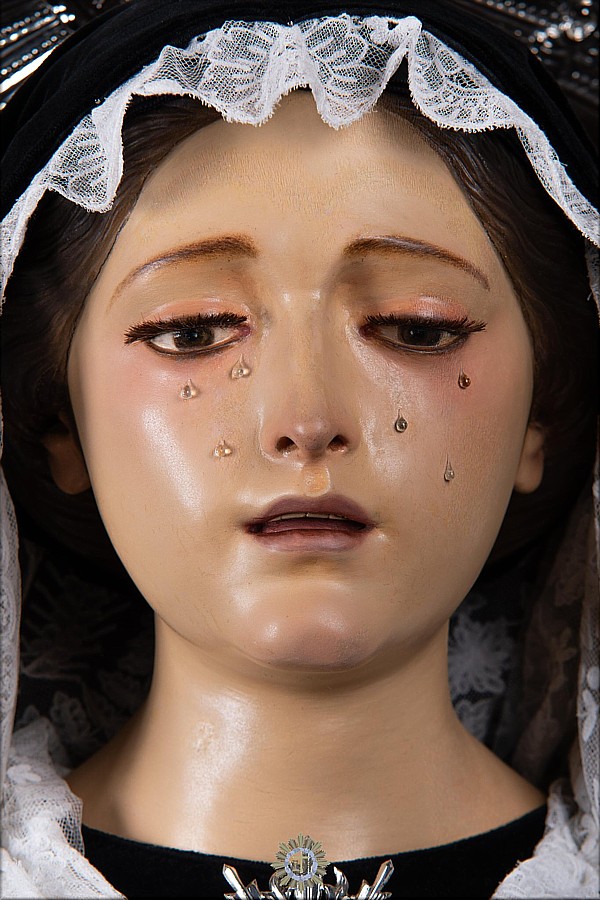Si bien la intervención del imaginero local Nicolás Perdigón Oramas en 1882 alteró la apariencia original, en concreto la región frontal y orbitaria del rostro, así como la inserción de una cabellera y nueva policromía amarillenta, la talla evidencia aún su origen hispalense. La imagen de Nuestra Señora de la Soledad perteneció al convento franciscano de San Lorenzo, en cuya iglesia tuvo altar propio al menos desde 1713. Sobrevivió al fatídico incendio de 1801, y, tras los procesos desamortizadores, pasó a la Parroquia Matriz de Nuestra Señora de la Concepción. En 1873 el entonces encargado de la iglesia exconventual de San Francisco, Telesforo García Rodríguez, solicitó al gobernador eclesiástico el traslado a su ubicación original, alegando que "perteneció a dicho convento, de donde fue trasladada a la parroquia referida". Desde 1991 procesiona en la tarde del Domingo de Ramos junto al paso de la Oración en el Huerto. |