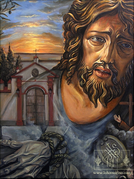 En la presentación del boceto, además de una conferencia a cargo de Montes Carpio sobre la escultura, tuvo lugar también la presentación del cartel de la bendición del Cristo, creación del pintor cordobés Miguel Ángel García Valenzuela, autor de otros muchos carteles cofrades y cuadros de temática religiosa, entre ellos el cartel oficial de la Semana Santa de Córdoba del presente año 2012. El cartel ha sido pintado al óleo sobre tabla, con unas medidas de 90 x 70 cm. Se trata de una composición en la que se entremezcla el semblante del Cristo -pintado el modelo en barro para seguir guardando su aspecto final hasta el día de la bendición-, el escudo de la futura hermandad, el convento de los capuchinos -muy ligados a esta agrupación- y las manos prendidas. En el lateral derecho aparecen unas ramas de olivo, en alusión al momento de la Pasión que se va a representar. Todo ello se enmarca en las luces de un atardecer. |