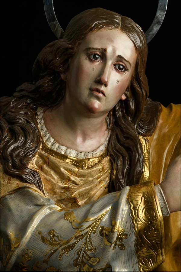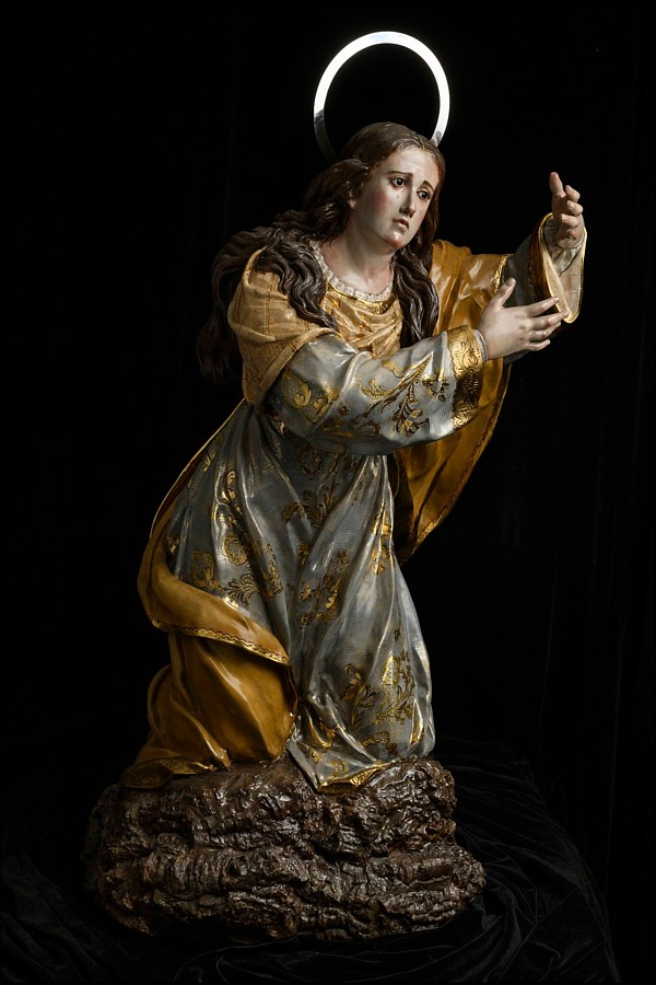 Santa María Magdalena Hoy ha sido presentada en el Museo Diocesano de Orihuela esta escultura en madera policromada de la santa, obra de los imagineros murcianos Juan y Sebastián Martínez Cava (Hermanos Cava), dentro de un proyecto de recuperación patrimonial que ha sido promovido por la Mayordomía de Nuestro Padre Jesús. Con motivo de la Guerra Civil desaparecieron varias obras de Francisco Salzillo en Orihuela. Una de ellas fue la imagen de Santa María Magdalena que iba a los pies del Cristo de la Agonía. En el año 1773 se le encargó al escultor murciano un nuevo conjunto por la Venerable Orden Tercera de Nuestro Seráfico Padre San Francisco, Muy Ilustre Mayordomía de Nuestro Padre Jesús. Por acuerdo de la Junta de 16 de mayo de 1773 y a propuesta "del Hº Mayor se acordó se hiciese la imagen de Jesús en la Agonía con la Magdalena al pie" . En 1936 tuvo lugar el ataque al convento oriolano de los franciscanos, donde perecieron los más de once pasos que tenía la V.O.T. Sin embargo, la actuación de uno de los concejales del Ayuntamiento hizo que no ardiese en la hoguera el Cristo de la Agonía, que lo cogió y se lo llevó cargado, mientras eran quemados el resto de los pasos e incluso el patrón popular de la ciudad, Nuestro Padre Jesús Nazareno. Si bien, dicho concejal salvó al Cristo de la Agonía de la hoguera, no se pudo salvar a la Magdalena que iba a sus pies. La imagen de la Magdalena, ahora recreada con esta obra de los Cava, era una imagen de talla completa (al igual que el Cristo de la Agonía), que iba a los pies de la cruz del crucificado. Se encontraba arrodillada al costado derecho y abrazada a la base del "stipex". La Magdalena tiene un rostro aniñado donde se refleja el dolor de ver al Maestro crucificado como a un ladrón. El cabello lo tiene distribuido a la usanza de Salzillo, gran parte cayendo por la espalda y un mechón por los hombros. De las fotografías existentes en la actualidad, se adivina que la talla estaba policromada con colores claros y estofada con motivos vegetales y florales. A partir de hoy la nueva Magdalena de los Cava podrá disfrutarse en el Claustro Episcopal del Museo dentro de la exposición temporal Salzillo. El Cristo de la Agonía y María Magdalena, visitable hasta el 1 de marzo. Un momento histórico para el arte, la fe y la memoria del patrimonio de Orihuela. |