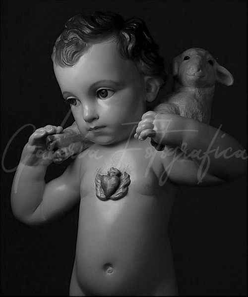 Niño Jesús Buen Pastor Coincidiendo con la festividad litúrgica del Buen Pastor, se bendijo en el templo parroquial de Nuestra Señora de la Granada, del municipio onubense de Moguer, esta nueva imagen del Niño Jesús para acompañar a la imagen de la Divina Pastora, que recibe culto en la localidad onubense desde 1956. El Niño, de 50 cm de altura, responde a la versión infantil del Buen Pastor cargando sobre sus hombros al cordero, símbolo del alma cristiana que se ha desviado del camino. Realizado en madera de cedro tallada y policromada al óleo, muestra el corazón llameante sobresaliendo del pecho. El origen de la iconografía se encuentra en la Antigua Grecia con los modelos del Moscóforo y el Hermes Kriophoros, siendo luego el modelo popularizado por artistas como el alemán Lucas Cranach y el español Bartolomé Esteban Murillo. La imagen mariana de la Divina Pastora, catalogada en el siglo XVIII, se cree que en principio fue una Inmaculada Concepción que fue adaptada a su actual iconografía. Procede del convento capuchino de Sevilla y fue restaurada por el escultor José María Leal en 2003 para recuperar su aspecto primitivo. |
