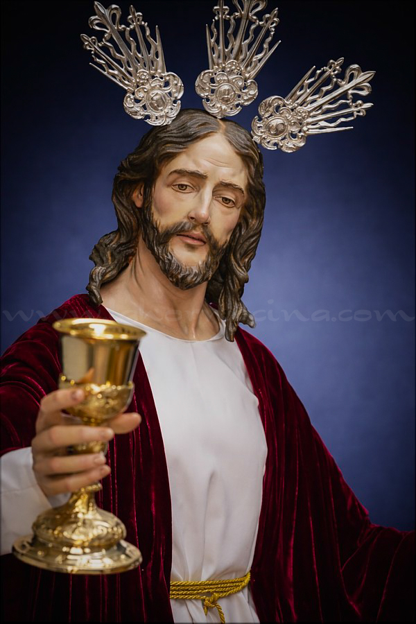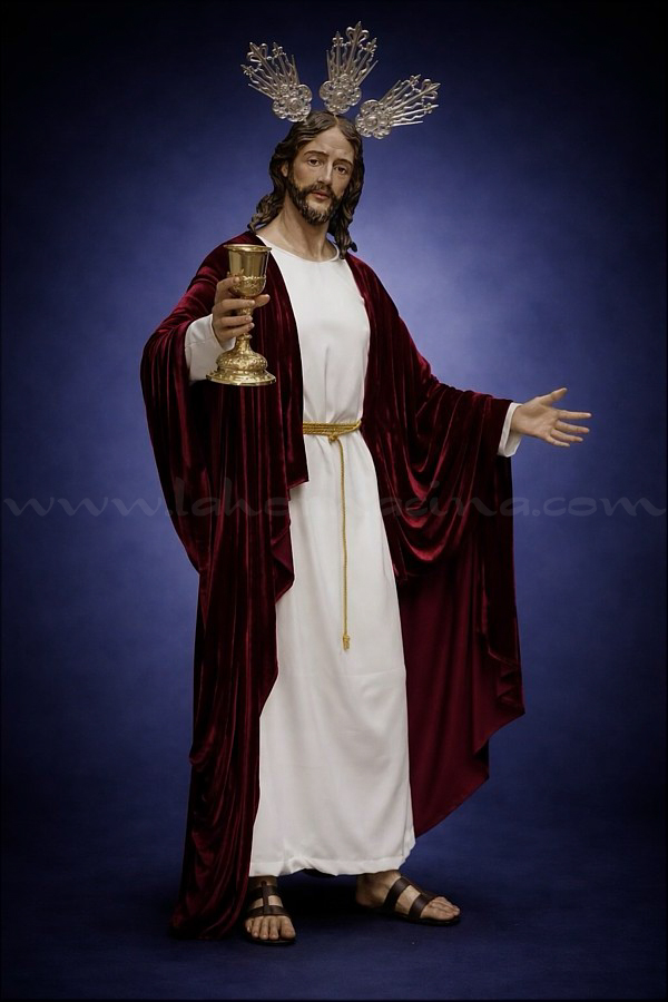 Jesús aparece representado como sacerdote y víctima la noche antes de comenzar su pasión, cuando toma el cáliz con el vino durante la celebración de su última cena con los doce apóstoles, un gesto que significa aceptar el sufrimiento y la muerte en la cruz a cambio de una redención eterna para la humanidad, lo que constituye el misterio central del cristianismo. Tanto el cáliz como el juego de potencias son piezas de orfebrería. |