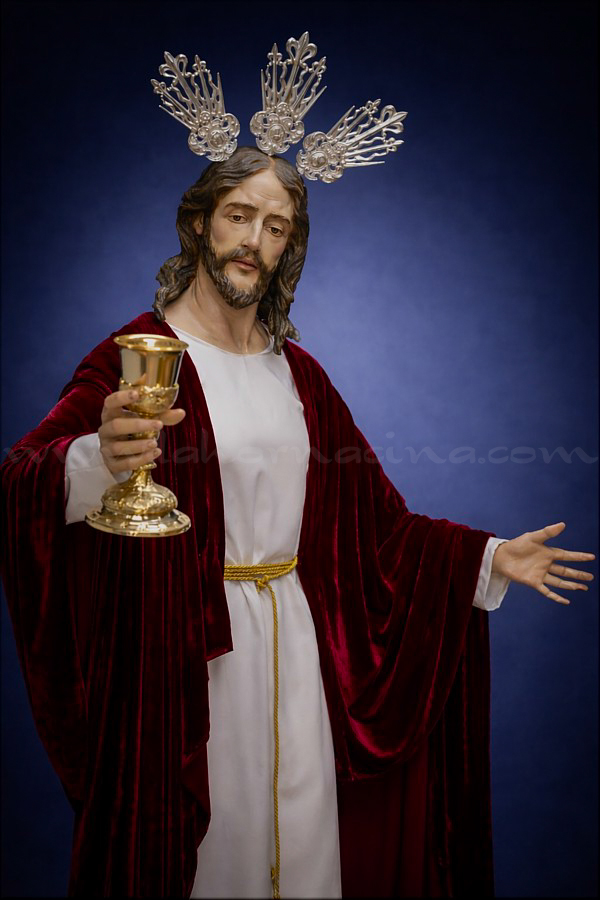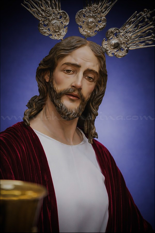 Señor de la Cena Imagen de talla completa, realizada íntegramente en madera de cedro, con una altura de 180 cm. Va revestida con túnica blanca y mantolín rojo, símbolos de la naturaleza divino de Cristo y de su sacrificio por la redención humana, respectivamente. Este proyecto, que ha requerido más de dos años de trabajo por parte del escultor e imaginero portuense, tiene como destino la ciudad de Logroño. |