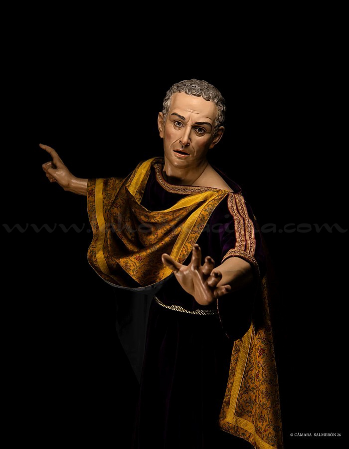 Poncio Pilato y Soldado Romano Ayer fueron presentadas en el Convento de San José, de Tobarra (Albacete), estas dos nuevas figuras realizadas por el joven escultor e imaginero de Mula (Murcia) para el misterio procesional de la Hermandad del Ecce Homo de dicha localidad, cuyo titular cristífero se atribuye a José Carbonell (hacia 1875), si bien el cuerpo, los pies y las manos pertenecen al artista valenciano José Dies López (1905-1969), que los talló para recomponer la imagen tras los daños sufridos en los disturbios de la Guerra Civil. Ambas obras han sido talladas a tamaño natural para vestir y policromadas al óleo por Pablo Espinosa Gómez, que en su ejecución ha empleado maderas de tilo y cedro. Ajustándose a la iconografía del Cristo, la escena representada es la de su presentación a las autoridades y al pueblo por Poncio Pilato, que adopta una teatral actitud declamatoria mientras señala al reo, indicando con su gesto hacer un último esfuerzo para conseguir, en vano, que se apiadasen de aquel hombre burlado, ensangrentado y cubierto de heridas. Por su parte, el soldado romano que, llevando la lanza y el casco, custodia a Cristo, parece mirarlo atentamente con altivez, pero también con gesto compasivo, dudando seriamente de que merezca la muerte. |
