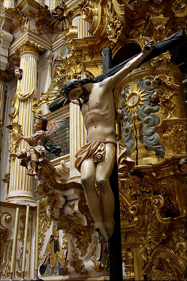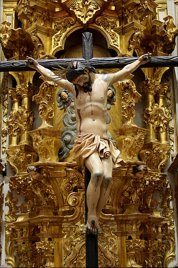 La obra restaurada, también conocida como Cristo del Pregón porque suele presidir los pregones de la Semana Santa de Estepa, muestra grandes analogías con otras creaciones del autor sobre el tema de la Crucifixión como el Cristo del Stabat Mater que corona el retablo estepeño de Santa María la Mayor, el Cristo de la Fundación (Hermandad de los Negritos, Sevilla), el Cristo del Mayor Dolor (Hermandad del Dulce Nombre, Sevilla) o el Cristo del grupo escultórico del Descendimiento del templo hispalense de San Vicente. Desde el punto de vista estilístico, la rotunda caída de la cabeza sobre el hombro, el tratamiento de la barba y el cabello -este último quizás con modificaciones como el del Cristo de la Fundación-, el tipo de laceraciones, y la composición elegante y sencilla, remiten indudablemente -entre otros detalles propios de la época sevillana bajorrenacentista- a las maneras de Andrés de Ocampo. La leve desproporción entre las piernas y el tronco puede responder a su primitiva ubicación rematando algún retablo mayor, altar o capilla. |