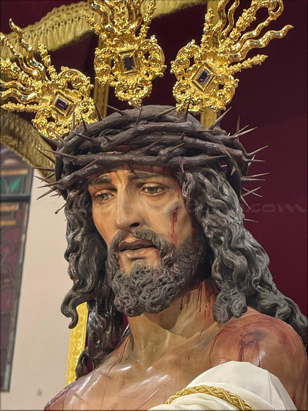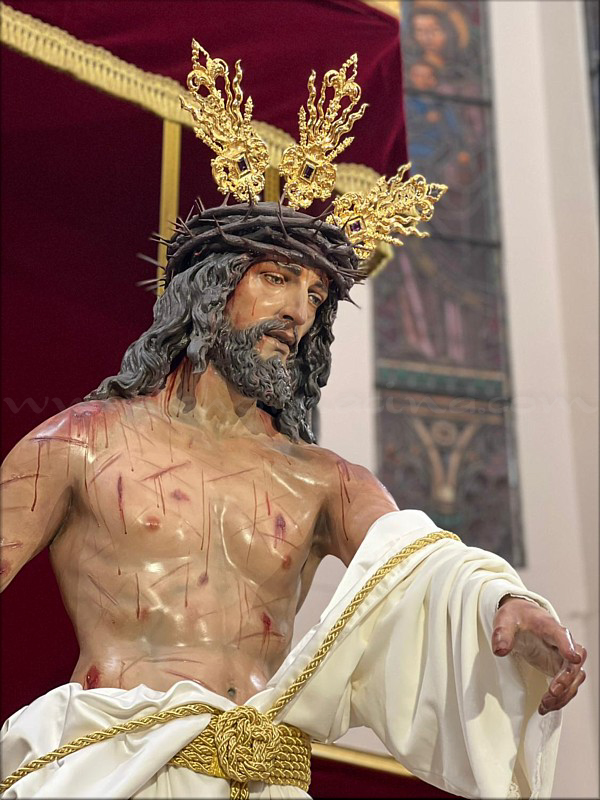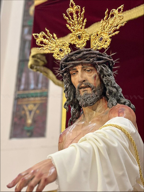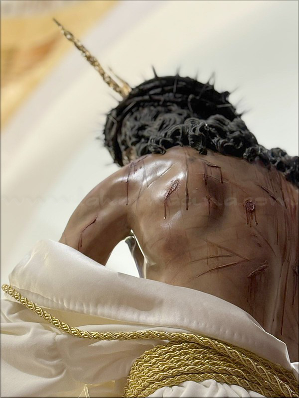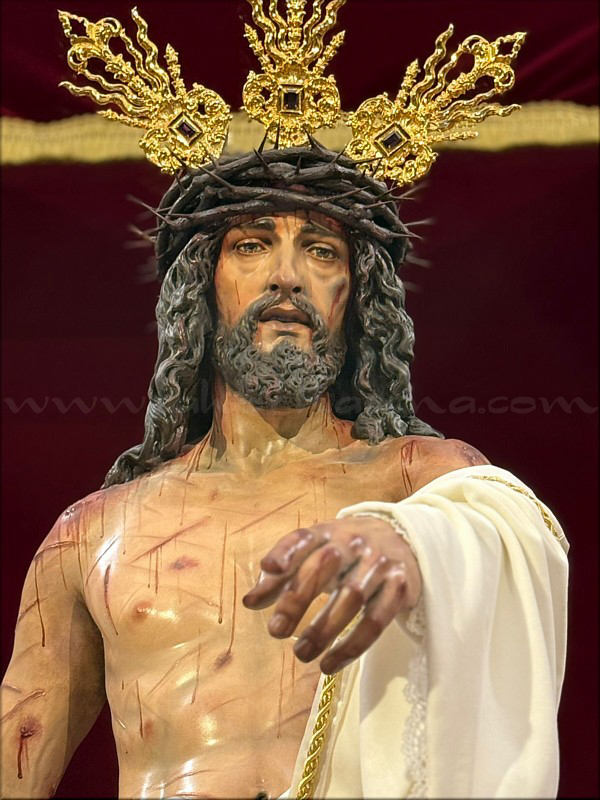 Nuestro Padre Jesús del Perdón despojado de sus vestiduras De gran fuerza expresiva, el Señor del Perdón ha sido realizado por el escultor e imaginero pontanés en madera de cedro real policromada al óleo, a tamaño natural (180 cm), completamente anatomizado, con la espalda lacerada por la flagelación y las rodillas sangrantes por las caídas sufridas camino del Calvario. Luce potencias del orfebre Raúl Cejas, según diseño de Javier Aguilar. Para la presentación ha sido ataviado por Fructuoso del Val. Es la primera imagen de un misterio que será llevado a cabo en los años venideros por Gálvez para plasmar una iconografía recurrente en los desfiles de Semana Santa desde la segunda mitad del siglo XX. El brazo derecho elevado es señal de que Jesús está siendo violentamente desnudado en público por sus verdugos, lo que en su época simbolizaba no ser nadie, solo un marginado despreciado por todos. Esta publicación será completada en las próximas semanas con un amplio reportaje gráfico del fotógrafo malagueño Luis Manuel Gómez Pozo. |